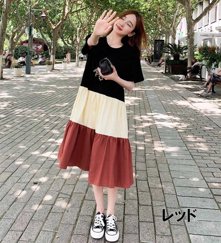 【送料無料】ロングワンピース ティアードワンピース クルーネック ミモレ丈 半袖 マルチカラ― カジュアル ハイウエスト きれいめ グリーン レッド 上品 華やか ゆったり お姉さん カワイイ ガーリー キュート レディース 着痩せ 着回し 脚長 おしゃれ 夏 サマー 大人可愛い 普段使い デイリー使い 休日 お出かけ デート 女子会 存在感 主役級 こなれ感 韓国ファッション 海外トレンド インスタ映え 大人気 流行 10代 20代 30代 40代 プチプラ db3650