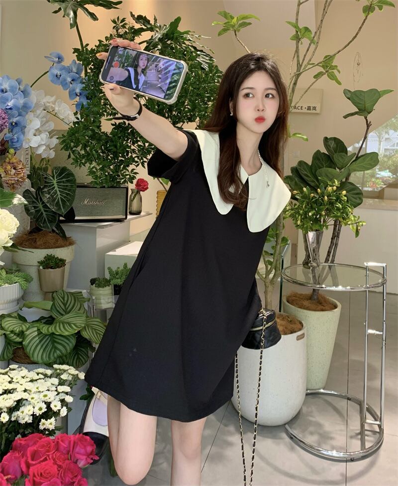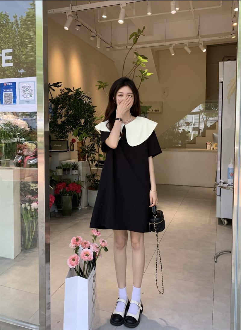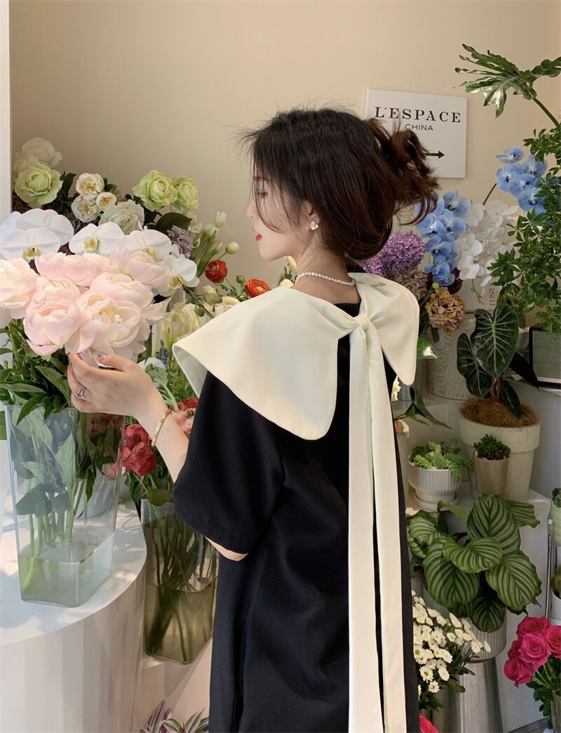 【送料無料】襟付きミニワンピース クルーネック ラージカラー 襟コンシャス ミディアム丈 半袖 フレアワンピース ブラック バックコンシャス リボン きれいめ 上品 華やか 学生 ゆったり お姉さん カワイイ ガーリー キュート レディース 着痩せ 着回し 脚長 おしゃれ 夏 サマー 大人可愛い 普段使い デイリー使い 休日 お出かけ デート 女子会 存在感 主役級 こなれ感 韓国ファッション 海外トレンド インスタ映え 大人気 流行 10代 20代 30代 40代 プチプラ db3652