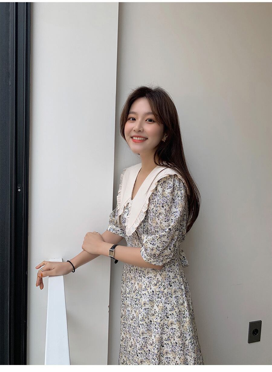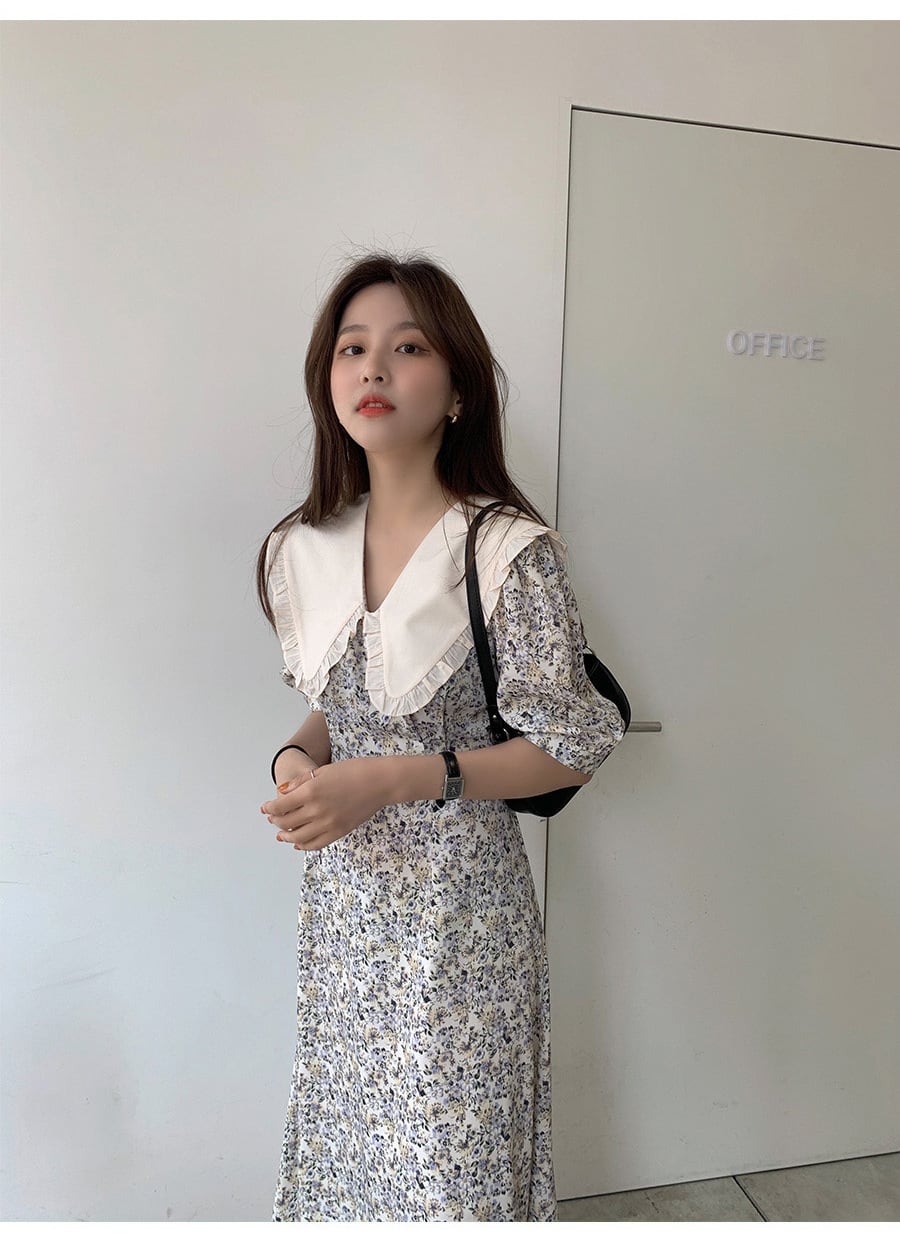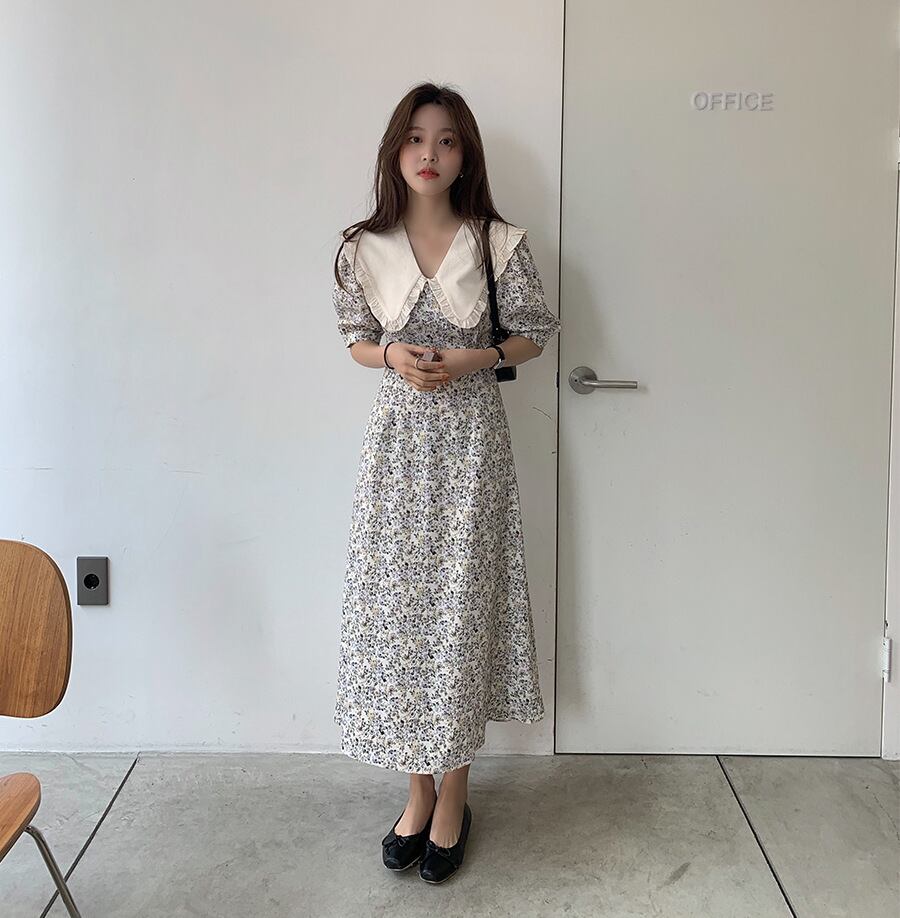 【送料無料】襟付きロングワンピース 花柄 フラワー Vネック フリル ラージカラー 襟コンシャス ミモレ丈 半袖 ハイウエスト アプリコット系 上品 華やか 学生 ゆったり お姉さん カワイイ ガーリー キュート レディース 着痩せ 着回し 脚長 おしゃれ 夏 サマー 大人可愛い 普段使い デイリー使い 休日 お出かけ デート 女子会 存在感 主役級 こなれ感 韓国ファッション 海外トレンド インスタ映え 大人気 流行 10代 20代 30代 40代 プチプラ db3654