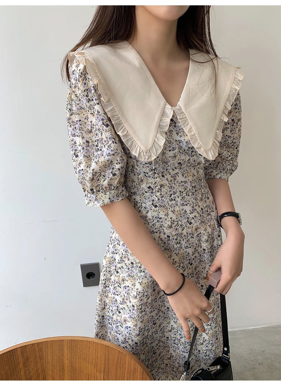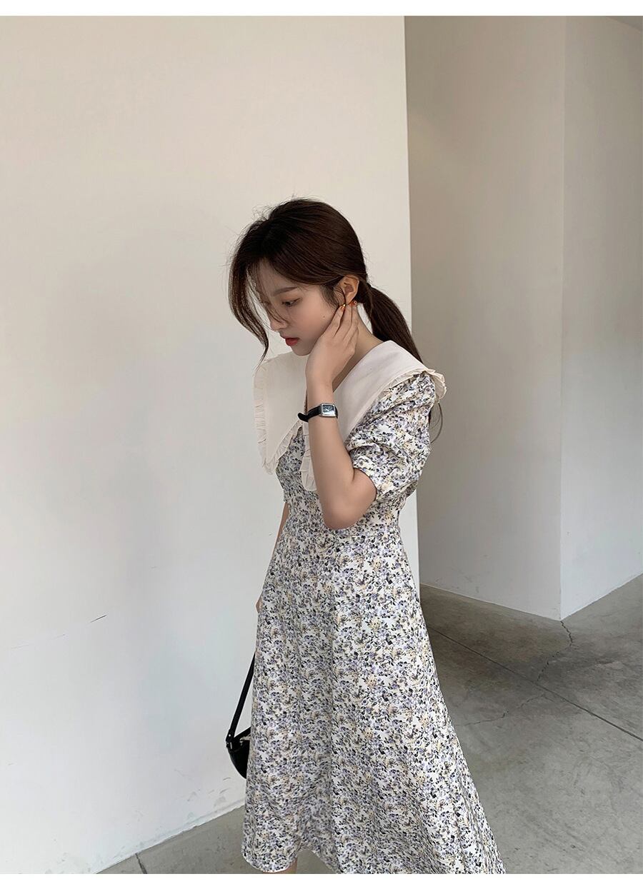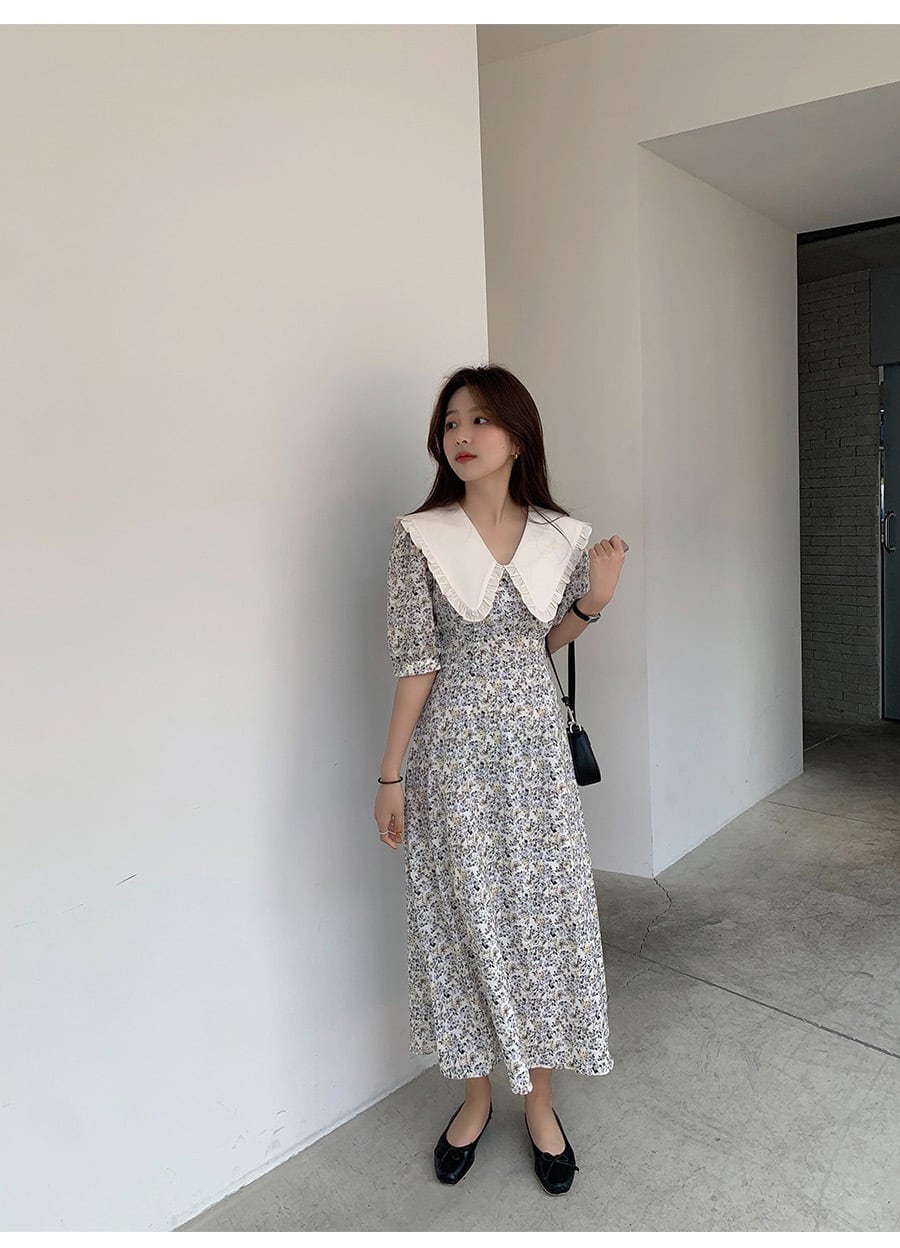 【送料無料】襟付きロングワンピース 花柄 フラワー Vネック フリル ラージカラー 襟コンシャス ミモレ丈 半袖 ハイウエスト アプリコット系 上品 華やか 学生 ゆったり お姉さん カワイイ ガーリー キュート レディース 着痩せ 着回し 脚長 おしゃれ 夏 サマー 大人可愛い 普段使い デイリー使い 休日 お出かけ デート 女子会 存在感 主役級 こなれ感 韓国ファッション 海外トレンド インスタ映え 大人気 流行 10代 20代 30代 40代 プチプラ db3654