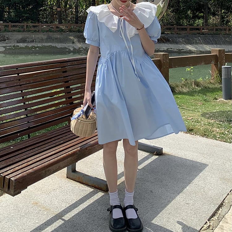 【送料無料】3色 襟付きミニワンピース ドレス 半袖 ラージカラー 襟コンシャス ブラック ブルー オレンジ 無地 上品 ウエストマーク ギャザー ハイウエスト シック エレガント きれいめ シンプル ゆったり お姉さん カワイイ レディース 着痩せ 着回し 脚長 ワンサイズ フリーサイズ おしゃれ 春 夏 大人可愛い 普段使い デイリー使い 休日 お出かけ デート 女子会 存在感 主役級 こなれ感 海外トレンド 大人気 流行 10代 20代 30代 40代 db3664