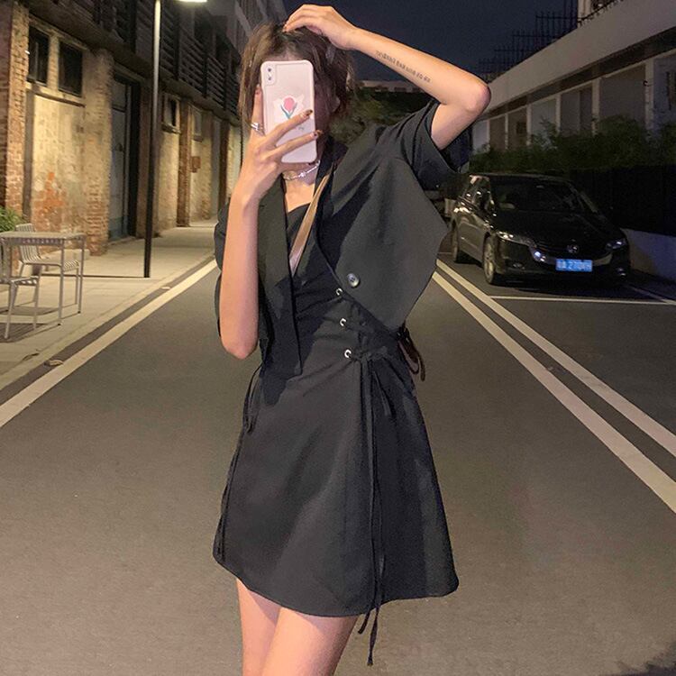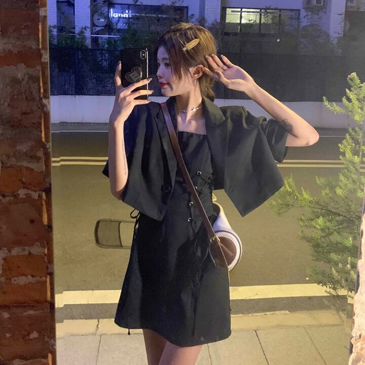 【送料無料】2色 セットアップ ジャケット ミニワンピース スーツ レースアップ キャミソールワンピース 上下セット ブラック ブルー セクシー カッコイイ 長袖 上着 アウター キャミソールワンピ ショート丈 大人可愛い おしゃれ こなれ感 きれいめ S M L XL 大きいサイズ 春 夏 秋 冬 10代 20代 可愛い 大人女子 お揃い 韓国 ファッション トレンド 主役級 お出かけ 二次会 パーティー ドレス お呼ばれ イベント 衣装 存在感 クラブ ギャル レトロ かわいい db3668