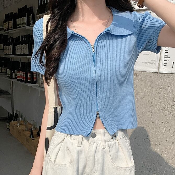 【送料無料】3色 Tシャツ ニット風 プルオーバー 半袖 ジップアップ カーディガン トップス レディース カットソー ブラック ホワイト ブルー 春 夏 クルーネック カッコイイ カジュアル 袖あり ラウンドネック 大人可愛い シンプル カジュアル 大人 おしゃれ かっこいい ラフ メンズライク ボーイッシュ 主役級 存在感 ボーダー 春 夏 10代 20代 30代 レディース デート お出かけ 着回し 普段使い 重ね着 韓国 オルチャン モテ プチプラ トレンド 流行 インスタ映え db3672