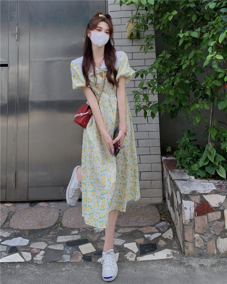 【送料無料】襟付きロングワンピース 花柄 フラワー Vネック カットアウト 二重襟 ラージカラー 襟コンシャス ミモレ丈 半袖 ハイウエスト イエロー 上品 華やか 学生 ゆったり お姉さん カワイイ ガーリー キュート レディース 着痩せ 着回し 脚長 おしゃれ 夏 サマー 大人可愛い 普段使い デイリー使い 休日 お出かけ デート 女子会 存在感 主役級 こなれ感 韓国ファッション 海外トレンド インスタ映え 大人気 流行 10代 20代 30代 40代 プチプラ db3675