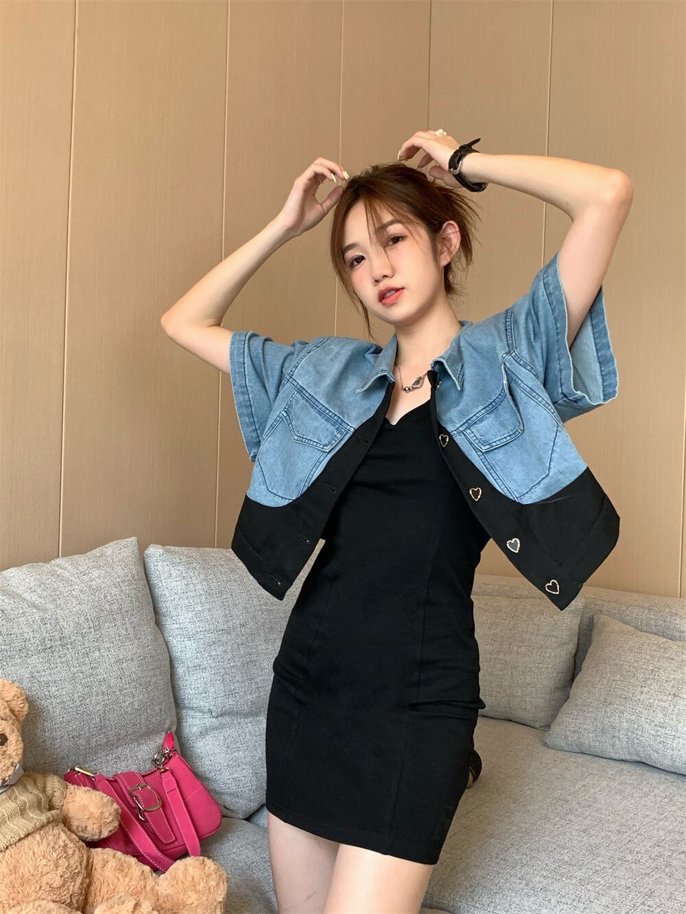 【送料無料】個性的 デニム シャツ 半袖 アウター ジャケット ショート丈 黒 無地 バイカラー ハート ボタン カジュアル 春 夏 秋 可愛い レトロ スポーティー かっこいい ルーズ デニムシャツ デニムジャケット 羽織 メンズライク ボーイッシュ イベント 衣装 クラブ ラフ こなれ感 ラフ 10代 20代 30代 着回し 海外 S M 韓国 クアンク コーデ ファッション ブルーデニム 薄色 淡色 映え セクシー ツートン ユニーク 上着 ジャンパー お出かけ db3681