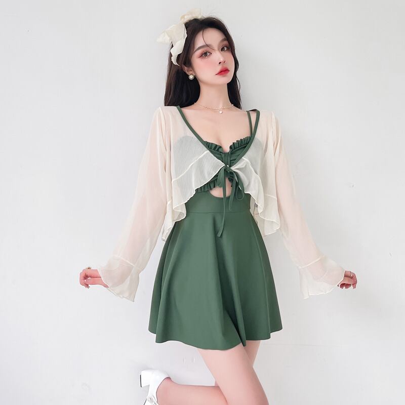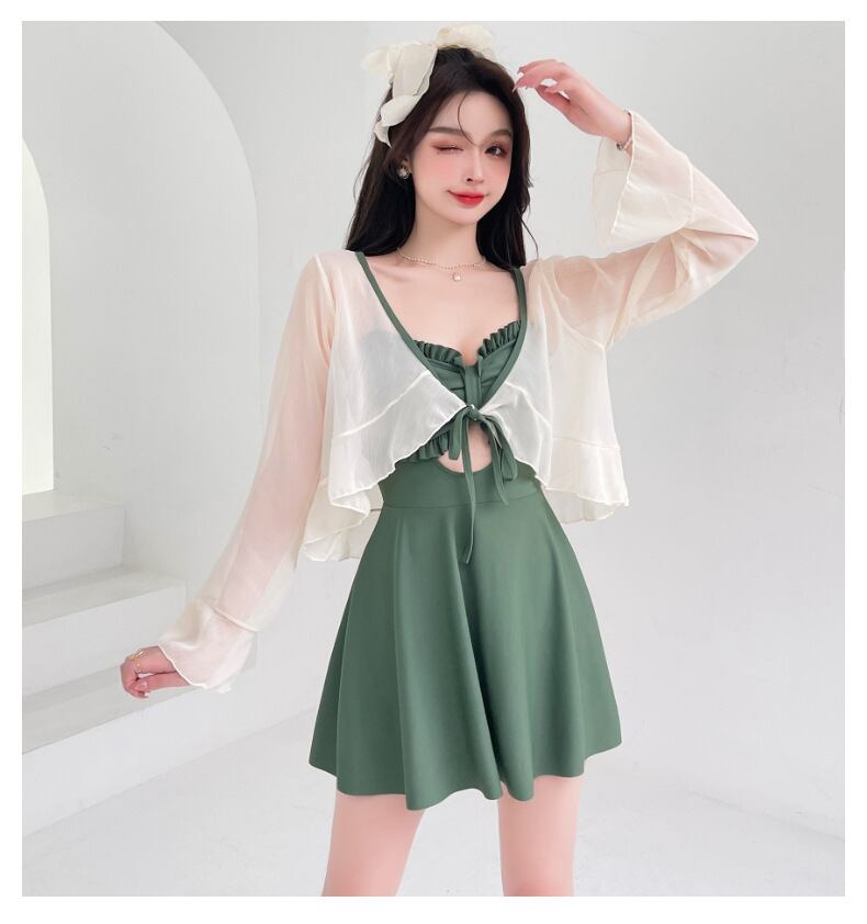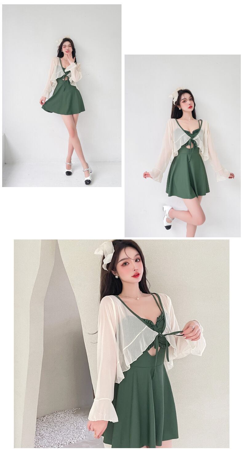 【送料無料】3色 水着 ワンピース 長袖 日焼け止め 2点セット ツーピース フリル シック エレガント キュート ガーリー レトロ スリム ミニ ショート丈 可愛い 大人 スタイルアップ レディース ブラック グリーン イエロー 黄色 黒 緑 S M L XL 夏 サマー リゾート バカンス 海 プール スイム スイムウェア おしゃれ デート 大人可愛い 存在感 こなれ感 抜け感 休日 主役級 インスタ映え 韓国ファッション 海外トレンド 大人気 高見え 流行 10代 20代 30代 db3710