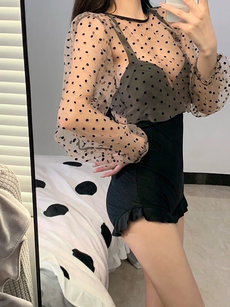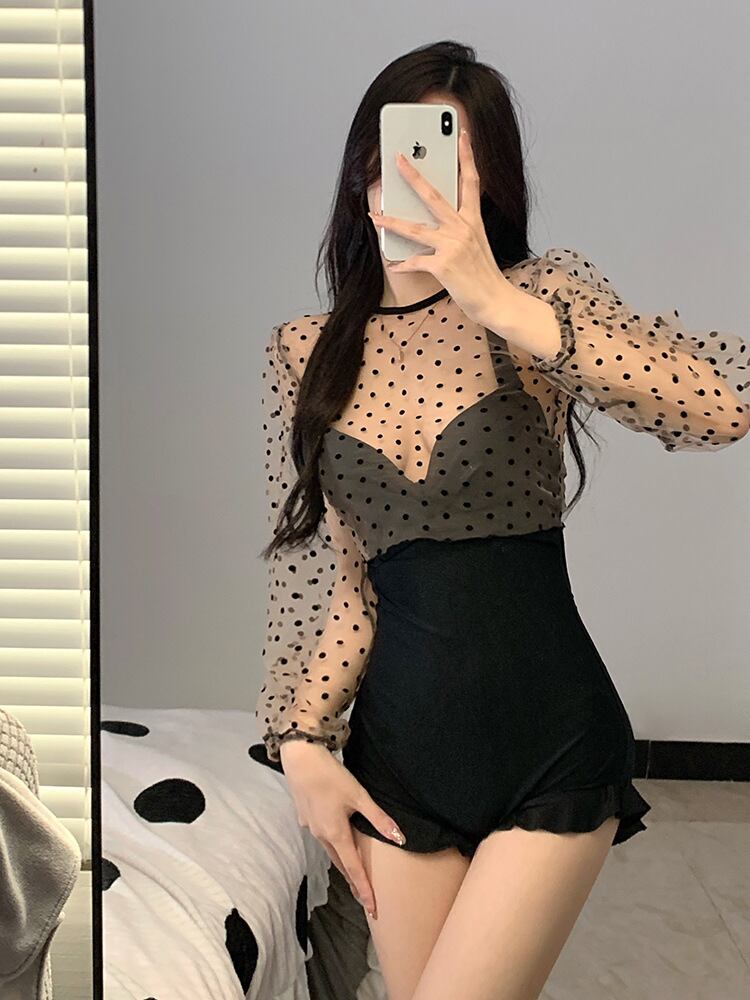 【送料無料】ワンピース 長袖水着 ドット シースルー 着痩せ ガーリー キュート 2点セット ツーピース シック レトロ スリム セクシー スタイリッシュ 可愛い 大人 お姉さん イイ女 スタイルアップ モテ レディース ブラック 黒 M L XL 夏 サマー リゾート バカンス 海 プール スイム スイムウェア おしゃれ デート 大人可愛い 存在感 こなれ感 抜け感 休日 主役級 インスタ映え 韓国ファッション 海外トレンド 大人気 高見え 流行 10代 20代 30代 db3734