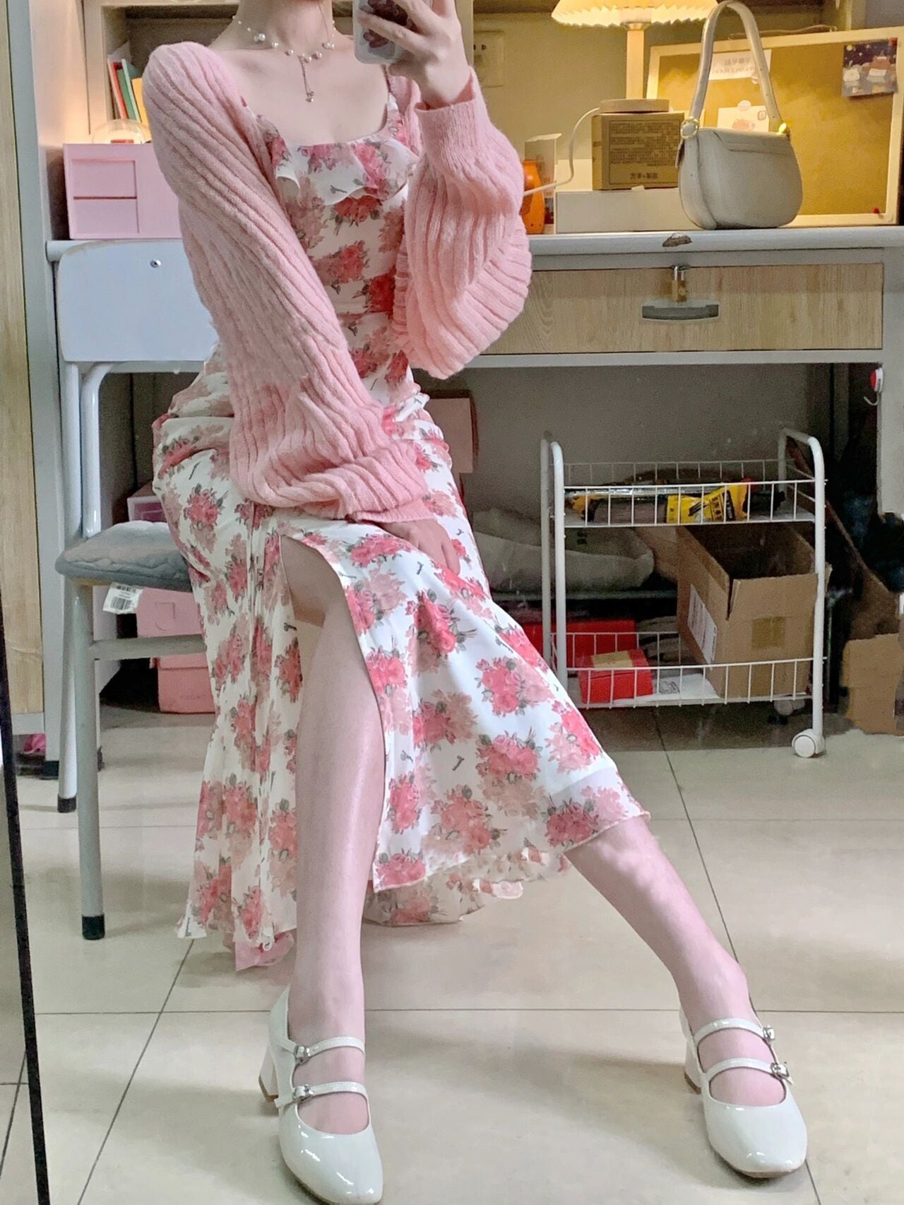 【送料無料】花柄ワンピース カーディガン ニット セットアップ ツーピース 2点セット ロング ミモレ丈 レース ガーリー プリティ きれいめ お姫様 お姉さん スリット モテる レディース ピンク 華やか 大人可愛い 春 夏 S M L XL 2XL 脚長 美脚 着痩せ 着回し スタイルアップ カワイイ 夏 デート 女子会 普段使い デイリー使い 休日 お出かけ 存在感 主役級 こなれ感 インスタ映え 韓国ファッション 海外トレンド 大人気 高見え 流行 10代 20代 30代 db3755