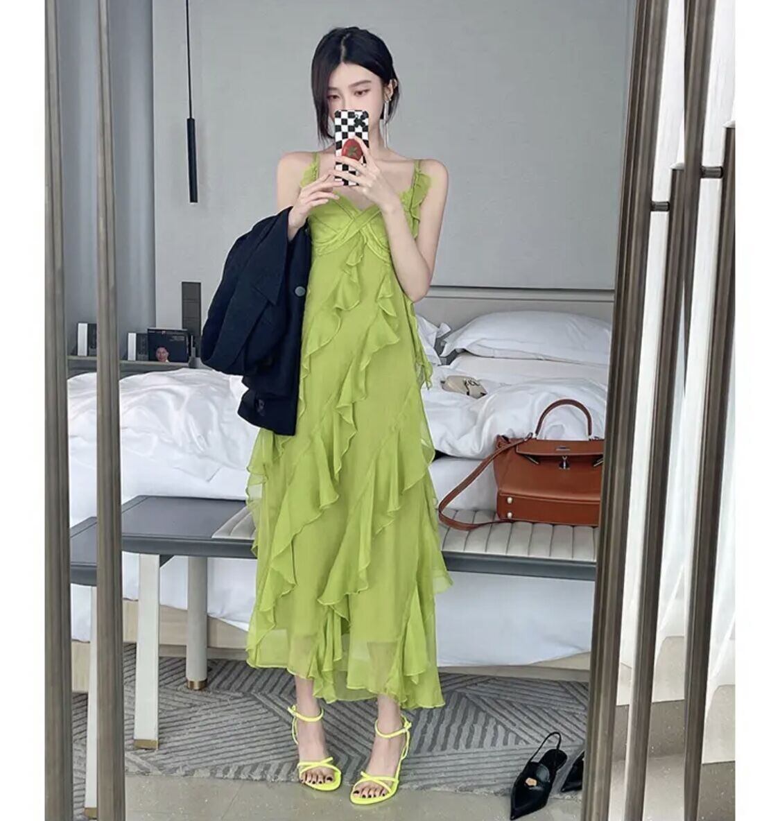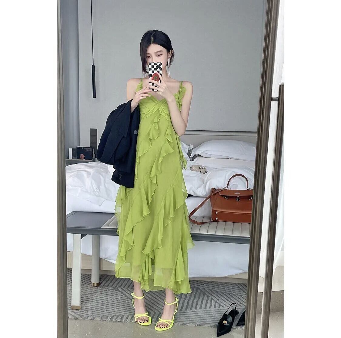 【送料無料】キャミワンピース フリル 透け感 ドレス ロング ミモレ丈 タイト 無地 シンプル クール カッコイイ プリティ キュート シンプル ウエストマーク パーティ 大人 スタイルアップ お姉さん カワイイ レディース 着痩せ 着回し 脚長 S M L おしゃれ 夏 サマー グリーン 緑 大人可愛い 普段使い デイリー使い 休日 お出かけ デート 女子会 存在感 主役級 こなれ感 韓国ファッション 海外トレンド インスタ映え 大人気 流行 10代 20代 30代 40代 プチプラ db3775