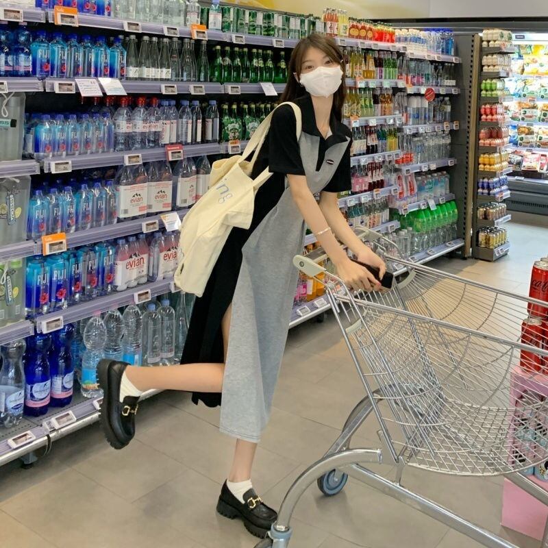 【送料無料】半袖ワンピース ロング ミモレ丈 Aライン スカート ウエストマーク バイカラー レトロ 無地 シンプル クール きれいめ キュート プリティ シンプル ハイウエスト 大人 スタイルアップ お姉さん カワイイ レディース 着痩せ 着回し 脚長 S M L XL おしゃれ 夏 サマー グレー ブラック 灰色 黒 大人可愛い 普段使い 休日 お出かけ デート 女子会 存在感 主役級 こなれ感 韓国ファッション 海外トレンド インスタ映え 大人気 流行 10代 20代 30代 プチプラ db3893