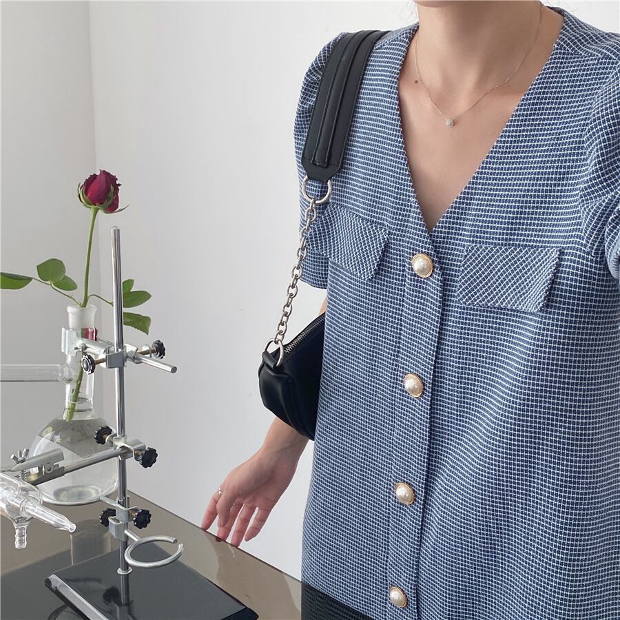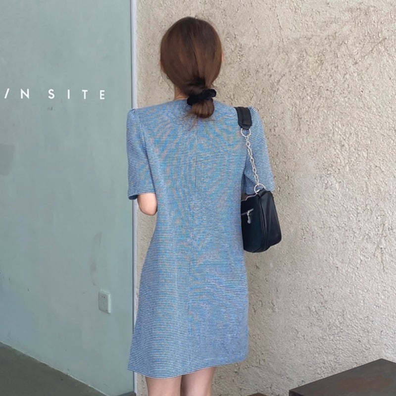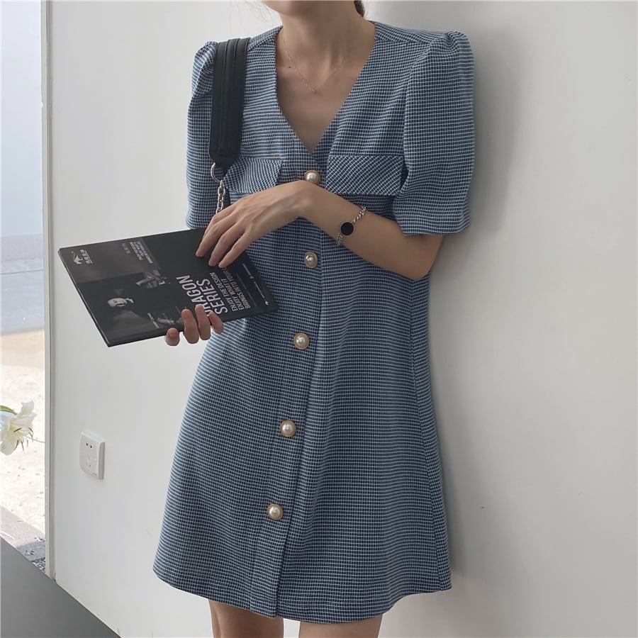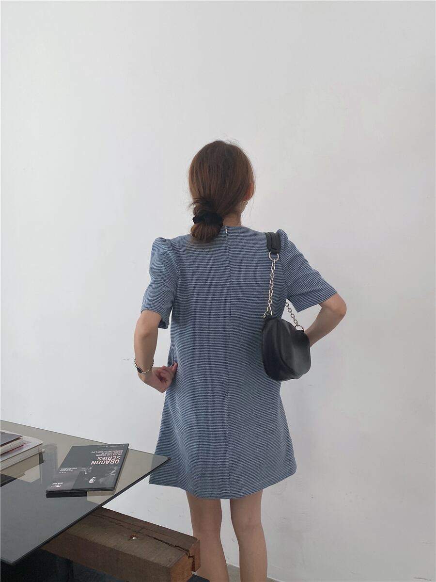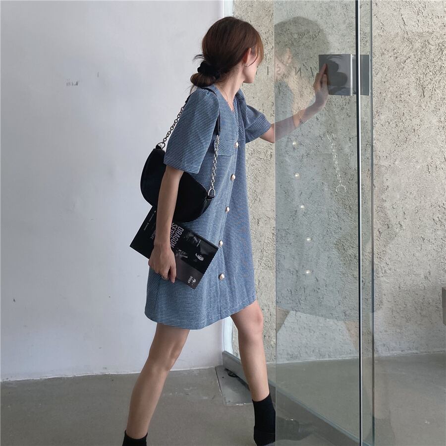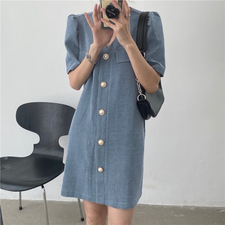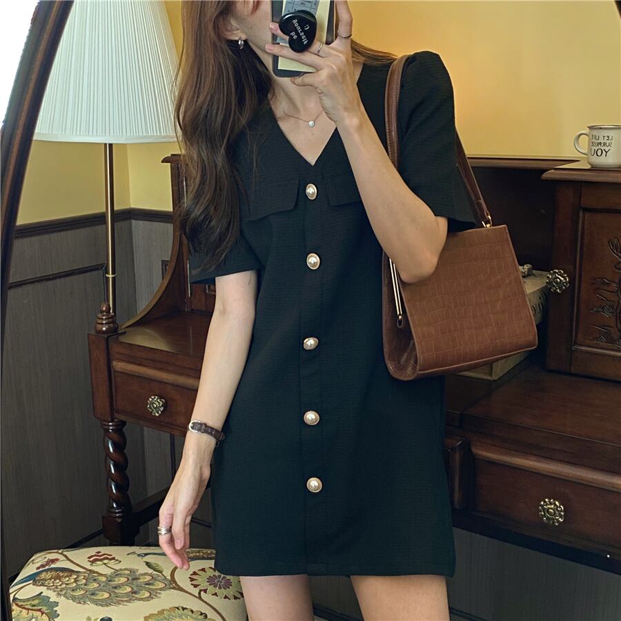 【送料無料】2色 半袖ワンピース パール ミニ ショート丈 スカート Vネック ゆったり レトロ クール きれいめ カッコイイ カジュアル シンプル 大人 スタイルアップ お姉さん レディース 着痩せ 着回し 脚長 ワンサイズ フリーサイズ おしゃれ 春 夏 ブルー ブラック 青 黒 大人可愛い 普段使い デイリー使い 休日 お出かけ デート 女子会 存在感 主役級 こなれ感 韓国ファッション 海外トレンド インスタ映え 大人気 流行 10代 20代 30代 40代 プチプラ db3903