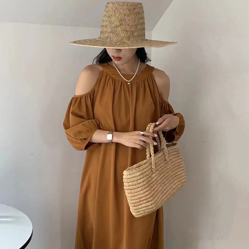 【送料無料】肩出しワンピース ロング マキシ丈 スカート ゆったり オフショルダー オフショル レトロ クール きれいめ カッコイイ シンプル 大人 スタイルアップ お姉さん レディース 着痩せ 着回し 脚長 S M L XL 大きいサイズ おしゃれ 春 夏 ブラウン 茶色 大人可愛い 普段使い デイリー使い 休日 お出かけ デート 女子会 存在感 主役級 こなれ感 韓国ファッション 海外トレンド インスタ映え 大人気 流行 10代 20代 30代 40代 プチプラ db3905