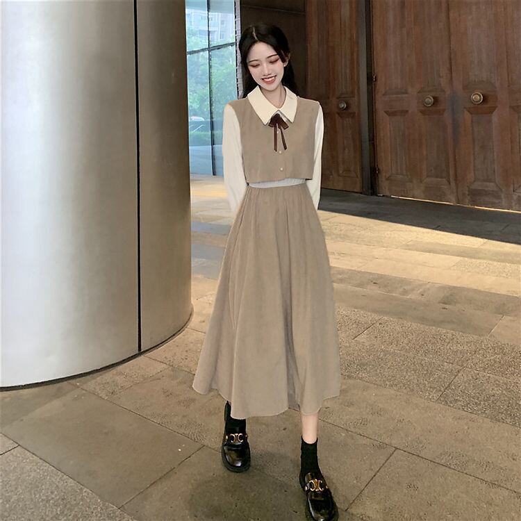 【送料無料】2色 レイヤード風ワンピース リボン コーデュロイ かわいい 大人可愛い きれいめ おしゃれ 清楚 レトロ お洒落 こなれ感 ラブリー キュート 大人 無地 レディース 長袖 ハイウエスト 主役級 存在感 抜け感 秋 冬 演奏会 お呼ばれ 20代 30代 40代 レディース 女性用 通勤 学生 通学 デート お出かけ 女子会 着回し 普段使い 韓国 韓国系 オルチャン ファッション コーデ スタイル モテ プチプラ デイリー使い S M L XL 2XL 黒 ブラック ベージュ db4036