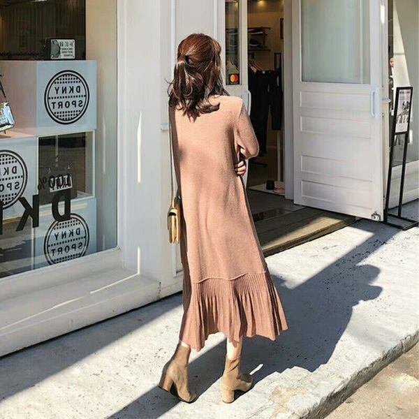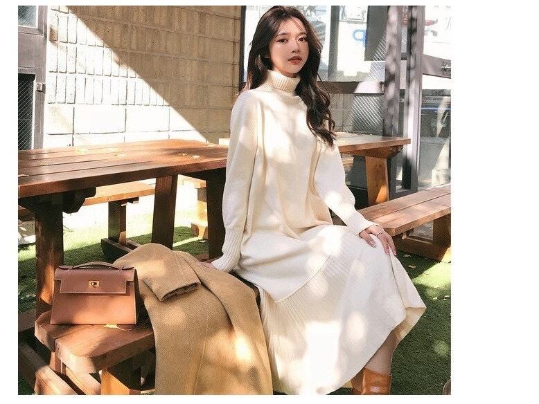 【送料無料】5色 長袖ニットワンピース セーター ハイネック タートルネック ミモレ丈 ロング スカート クール カッコイイ キュート プリティ ゆったり シンプル 大人 スタイルアップ ウエストマーク お姉さん レディース 着痩せ 着回し 脚長 M L ブラウン ブラック ピンク ベージュ ホワイト 大人可愛い 普段使い デイリー使い 休日 お出かけ デート 女子会 存在感 主役級 こなれ感 韓国ファッション 海外トレンド インス映え 大人気 流行 10代 20代 30代 40代 プチプラ db3949