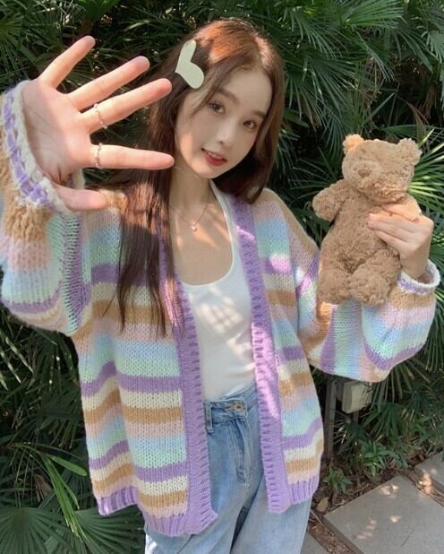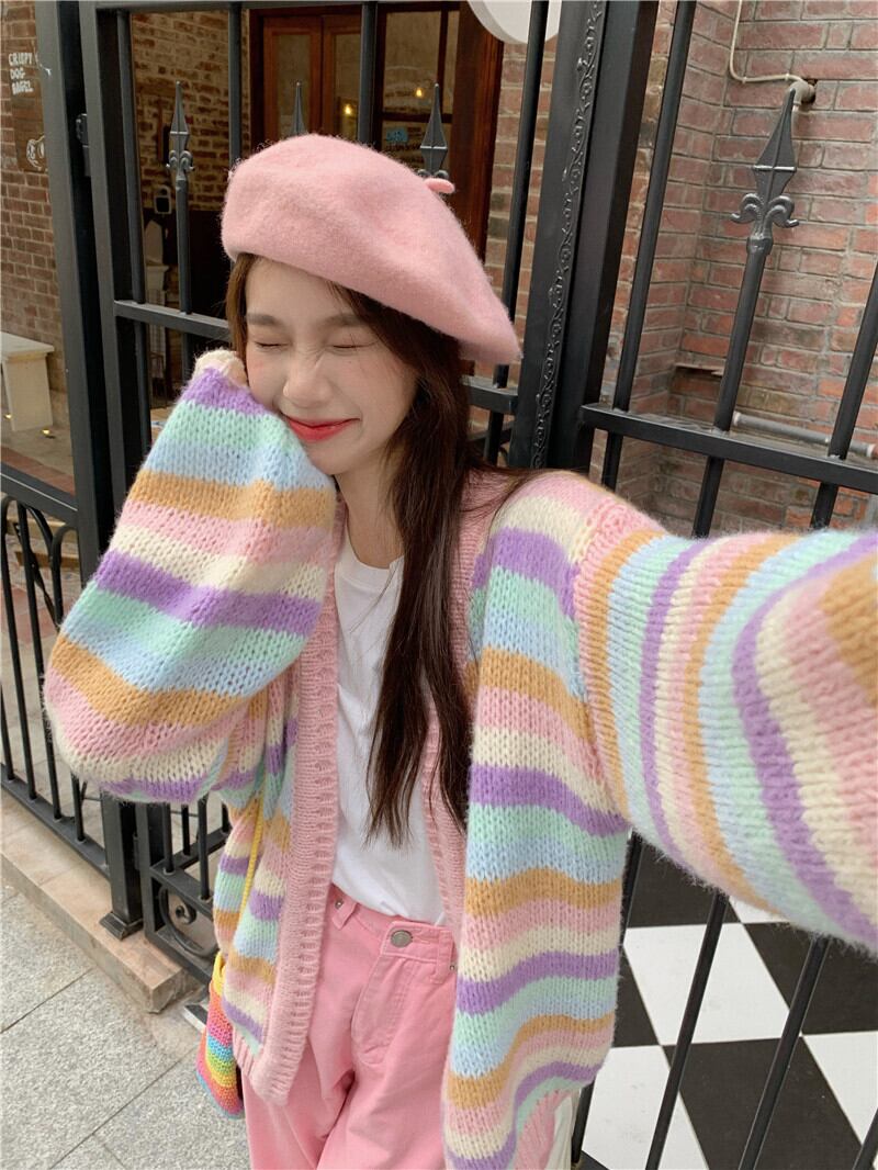 【送料無料】2色 ボーダーニット セーター カラフル カーディガン 羽織り かわいい 大人可愛い きれいめ カジュアル おしゃれ お洒落 ラブリー キュート 個性的 主役級 存在感 レディース 長袖 甘め 柄 ストライプ 秋 冬 10代 20代 レディース キッズ 学生 通学 デート お出かけ 女子会 休日 着回し 普段使い 重ね着 韓国 韓国系 オルチャン ファッション コーデ スタイル モテ トレンド 流行 インスタ映え ワンサイズ フリーサイズ 紫 パープル ピンク レインボー db4043
