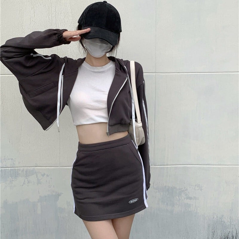 スポーティーなジップパーカーとミニスカートのセットアップです。