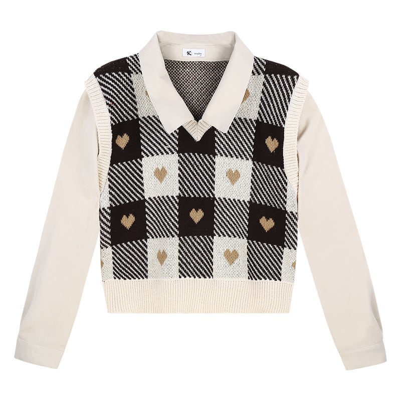 【送料無料】2色 ドッキングニット ニットベスト レイヤード風 スクエア柄 チェック柄 ハート トップス かわいい 大人可愛い カジュアル おしゃれ お洒落 レトロ こなれ感 ラブリー キュート 個性的 主役級 存在感 抜け感 レディース 長袖 秋 冬 10代 20代 女の子 学生 通学 デート お出かけ 女子会 休日 着回し 普段使い 重ね着 韓国 韓国系 オルチャン ファッション コーデ スタイル モテ ワンサイズ フリーサイズ 黒 ブラック 茶色 ブラウン インスタ映え db4055