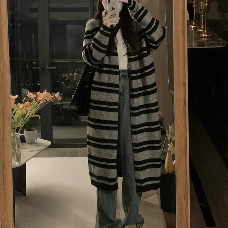 【送料無料】ロングニット カーディガン セーター ボーダー柄 ストライプ 羽織り トップス かわいい 大人可愛い きれいめ カジュアル おしゃれ お洒落 ラブリー キュート 個性的 主役級 存在感 レディース 長袖 ロング ロング丈 柄 秋 冬 10代 20代 30代 女の子 学生 通学 デート お出かけ 女子会 休日 着回し 普段使い 重ね着 韓国 韓国系 オルチャン ファッション コーデ スタイル モテ トレンド 流行 インスタ映え S M L XL 灰色 グレー db4051