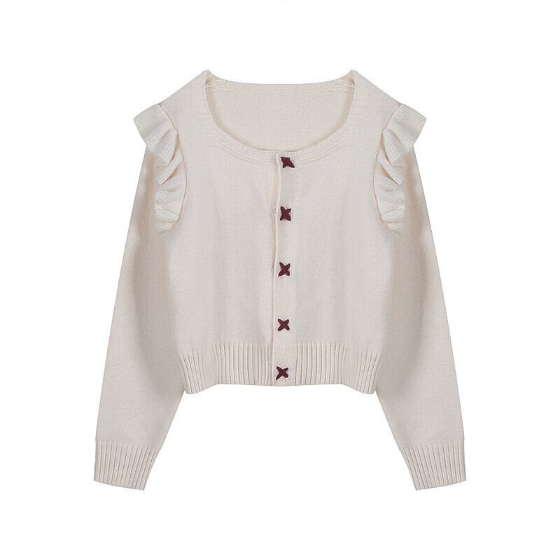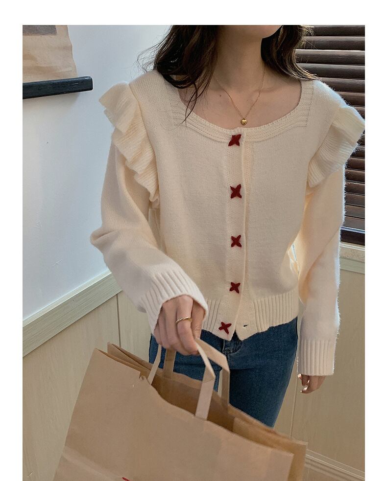 【送料無料】3色 長袖ニット セーター カーディガン ショルダーフリル トップス 長袖 スクエアネック トップス かわいい 大人可愛い きれいめ おしゃれ お洒落 キュート ラブリー ガーリー 主役級 存在感 レディース 柄 秋 冬 10代 20代 30代 女性用 女の子 学生 通学 デート お出かけ 女子会 休日 着回し 普段使い 重ね着 韓国 韓国系 オルチャン ファッション コーデ スタイル インスタ映え フリーサイズ ワンサイズ 白 ホワイト 赤 レッド ブルー 青 db4059