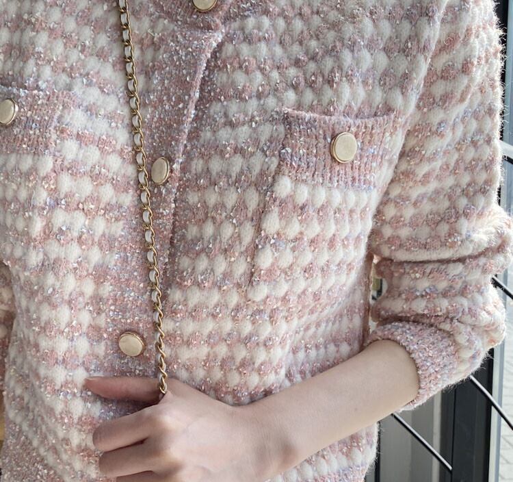【送料無料】3色 長袖ニット セーター カーディガン ツイード風 トップス 長袖 クルーネック トップス かわいい 大人可愛い きれいめ おしゃれ お洒落 キュート ラブリー ガーリー 主役級 存在感 レディース 柄 秋 冬 10代 20代 30代 女性用 女の子 学生 通学 デート お出かけ 女子会 休日 お呼ばれ 発表会 着回し 普段使い 重ね着 韓国 韓国系 オルチャン ファッション コーデ スタイル インスタ映え フリーサイズ ワンサイズ ピンク ブルー ブラウン ブラック 黒 db4060