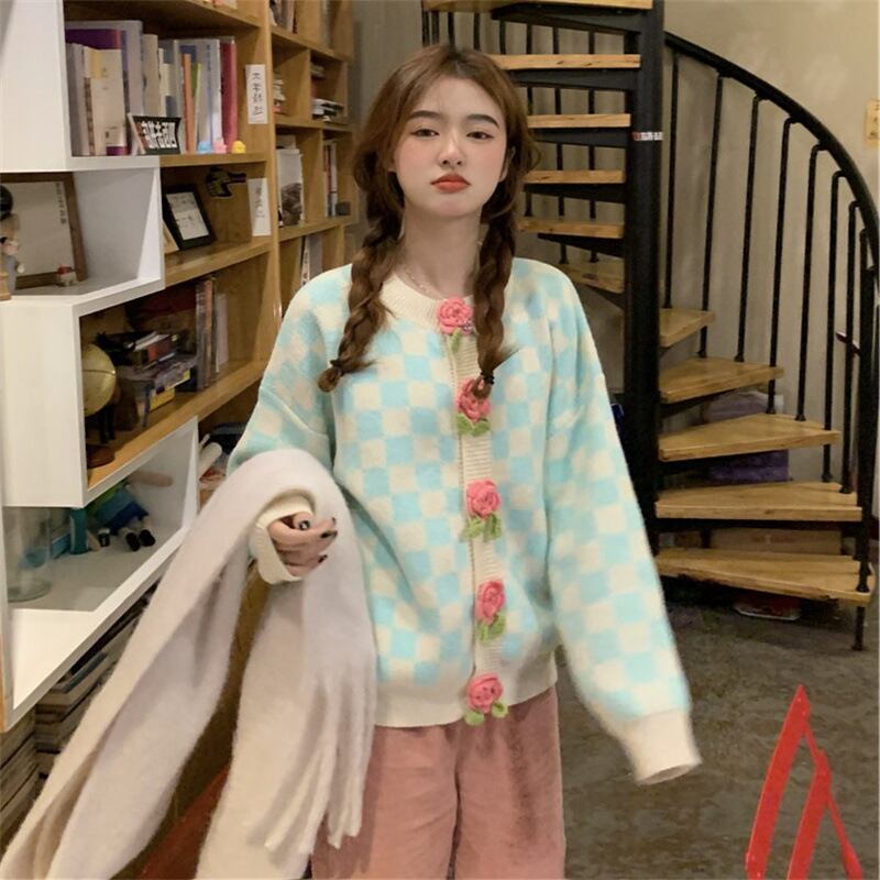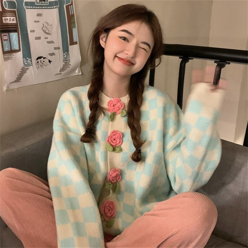 【送料無料】2色 長袖ニット セーター カーディガン チェック柄 バラ トップス 長袖 クルーネック 個性的 かわいい 大人可愛い きれいめ おしゃれ お洒落 キュート ラブリー ガーリー 主役級 存在感 レディース 柄 秋 冬 10代 20代 30代 女性用 女の子 学生 通学 デート お出かけ 女子会 休日 着回し 普段使い 重ね着 韓国 韓国系 オルチャン ファッション コーデ スタイル インスタ映え トレンド 流行 フリーサイズ ワンサイズ ライトブルー ピンク プチプラ db4063