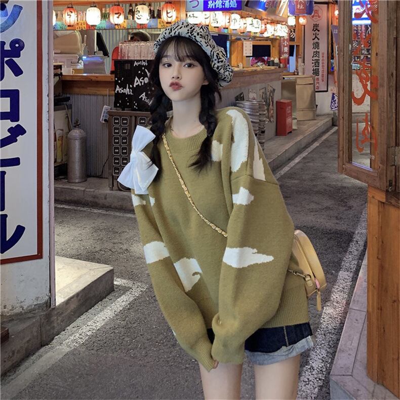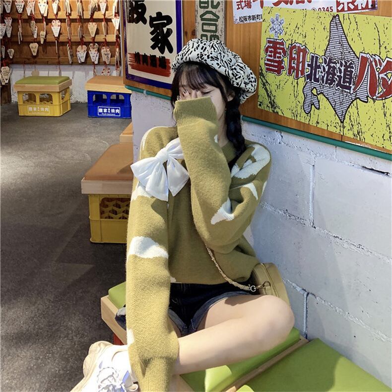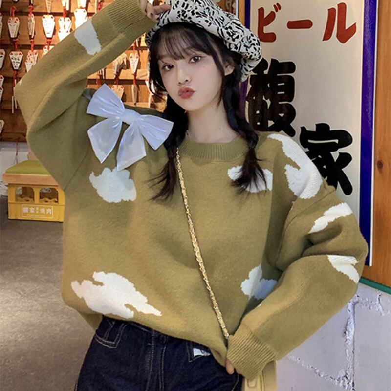 【送料無料】2色 長袖ニット セーター リボン クルーネック 長袖 ルーズ トップス かわいい 大人可愛い きれいめ おしゃれ お洒落 上品 キュート ラブリー ガーリー 個性的 主役級 存在感 レディース 秋 冬 10代 20代 女性用 女の子 学生 通学 デート お出かけ 女子会 休日 着回し 普段使い 重ね着 韓国 韓国系 オルチャン ファッション コーデ スタイル インスタ映え トレンド 流行 プチプラ フリーサイズ ワンサイズ オリーブ ブルー 青 ゆったり ゆる オーバーサイズ db4068