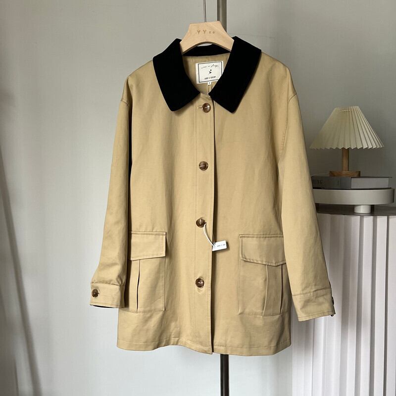 【送料無料】2色 ジャケット アウター バイカラー 薄手 トレンチ風 ステンカラー 上着 アウター べっ甲ボタン 大人可愛い きれいめ シンプル 上品 おしゃれ お洒落 かっこいい こなれ感 クール レディース ミディアム丈 長袖 襟付き 主役級 存在感 フォーマル オフィス 無地 春 秋 20代 30代 40代 女性用 ビジネス OL 通勤 デート お出かけ 女子会 着回し 普段使い 重ね着 韓国系 ファッション コーデ スタイル トレンド 流行 S M L ゆったり カーキ プチプラ db3994