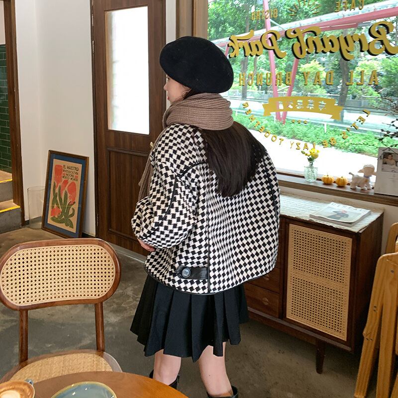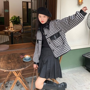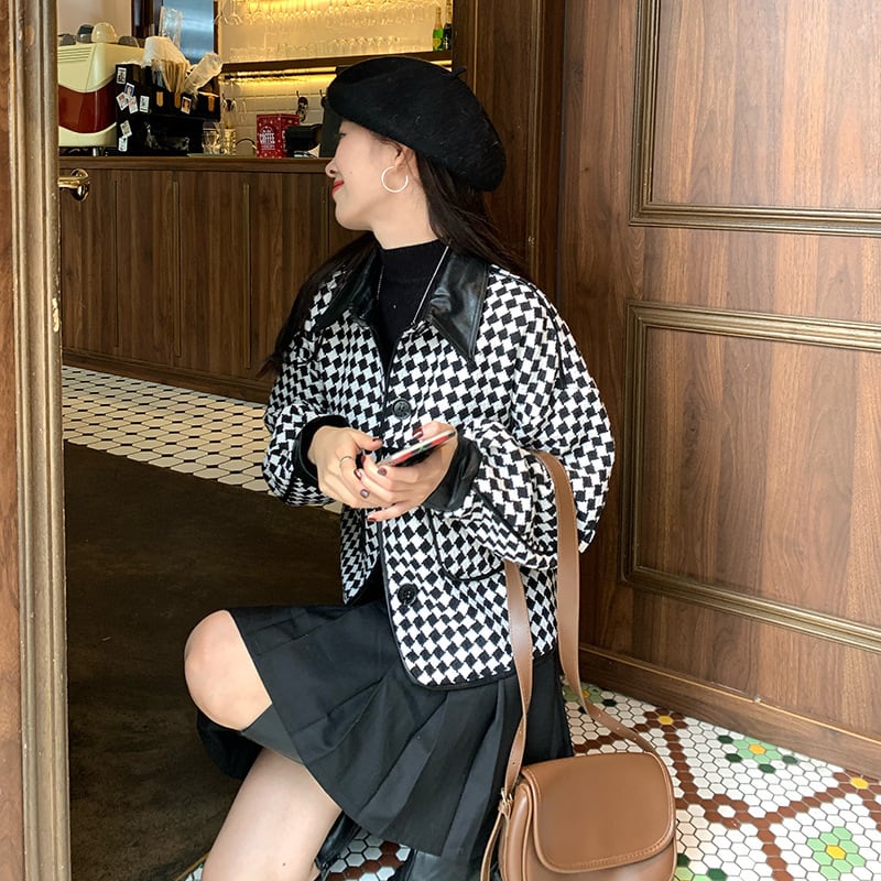 【送料無料】2色 チェック柄コート ジャケット ツイード フェイクレザー 切り替え 千鳥格子 ダイヤ柄 アウター ショート丈 かわいい 大人可愛い 上品 シンプル おしゃれ お洒落 こなれ感 ラブリー キュート レディース 襟なし 長袖 前開き レトロ 暖かい 防寒 秋 冬 10代 20代 30代 OL 通勤 学生 通学 デート お出かけ 女子会 休日 旅行 着回し 普段使い ファッション コーデ スタイル 体型カバー トレンド 流行 インスタ映え S M L 大きいサイズ プチプラ db4017