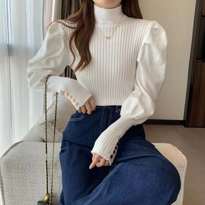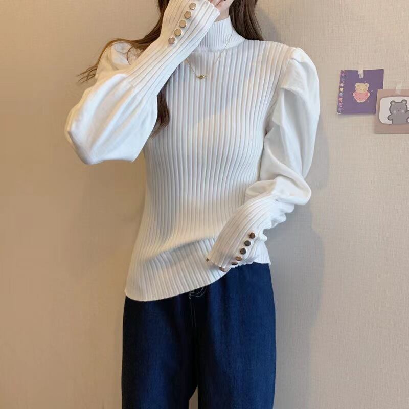 【送料無料】3色 ニット 長袖 トップス セーター ボリューム袖 タイト ボタン装飾 パワーショルダー タック リブニット プチハイネック トレンド 流行 個性的 長袖 肌見せ 肩見せ かわいい 大人可愛い きれいめ カジュアル おしゃれ お洒落 こなれ感 ラフ 主役級 存在感 無地 春 秋 10代 20代 30代 レディース 女の子 学生 通学 デート お出かけ 女子会 休日 着回し 普段使い 韓国系 オルチャン コーデ スタイル プチプラ ホワイト 白 ブラック 黒 グレー ブルー db3974