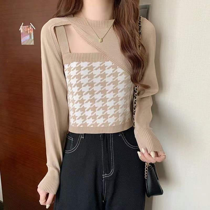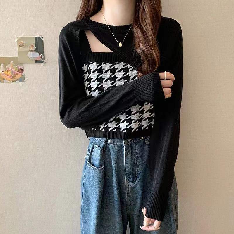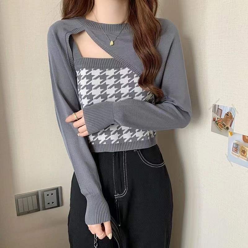 【送料無料】3色 ニット セットアップ キャミソール トップス カットアウト千鳥格子 チェック柄 スリット 長袖 クルーネック トレンド 流行 個性的 長袖 肌見せ 肩見せ かわいい 大人可愛い きれいめ カジュアル おしゃれ お洒落 こなれ感 ラフ 主役級 存在感 無地 春 秋 10代 20代 30代 レディース 女の子 学生 通学 デート お出かけ 女子会 休日 着回し 普段使い 韓国 韓国系 オルチャン コーデ スタイル プチプラ ホワイト 白 ブラック 黒 グレー カーキ ブラック db3976