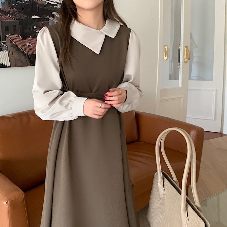 【送料無料】ワンピース ドレス ミモレ丈 スリット フェイクレイヤード ブラウス アシンメトリー タック クロス ハイウエスト 切り替え 甘め かわいい 大人可愛い きれいめ おしゃれ お洒落 こなれ感 ラブリー キュート ガーリー フェミニン 長袖 主役級 存在感 秋 冬 10代 20代 30代 レディース 女性用 学生 通学 デート お出かけ 女子会 着回し 普段使い 韓国 韓国系 オルチャン ファッション コーデ スタイル モテ トレンド 流行 インスタ映えフリーサイズ 黒 グレー db3999
