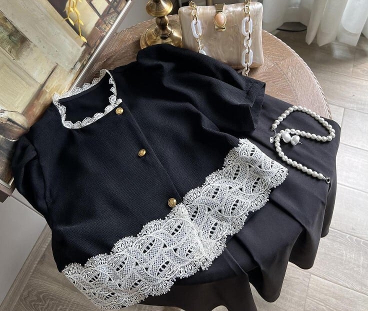 レースデザインが入ったジャケット風のトップスと、