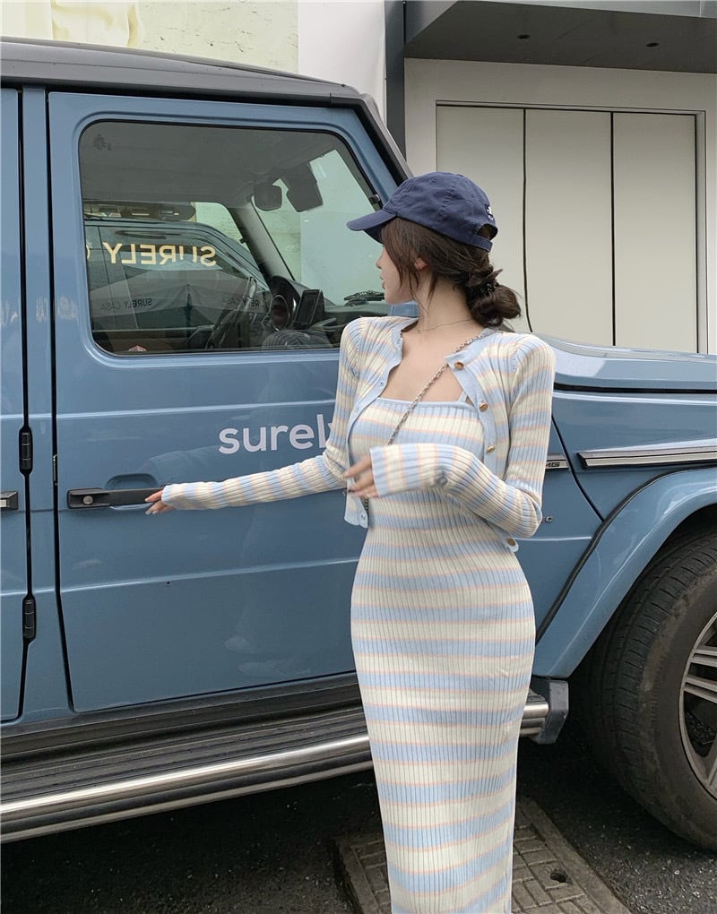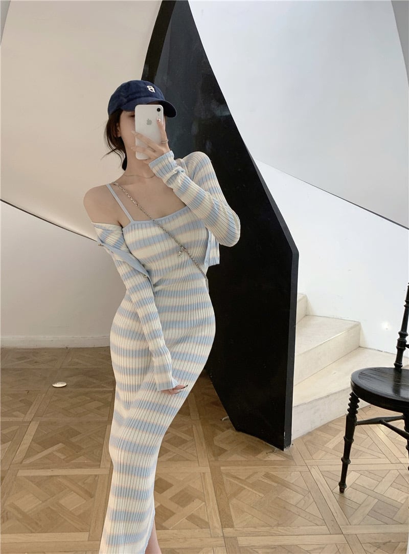【送料無料】3色 セットアップ 2点セット 長袖ニット カーディガン キャミワンピース 長袖 大人可愛い カジュアル シンプル かわいい おしゃれ お洒落 こなれ感 キュート フェミニン 主役級 存在感 とろみ感 抜け感 レディース ストライプ ボーダー 秋 10代 20代 30代 デート 女子会 休日 着回し 普段使い 韓国 韓国系 オルチャン ファッション コーデ スタイル モテ トレンド 流行 インスタ映え ワンサイズ フリーサイズ ブルー ピンク ブラック 黒 db4086