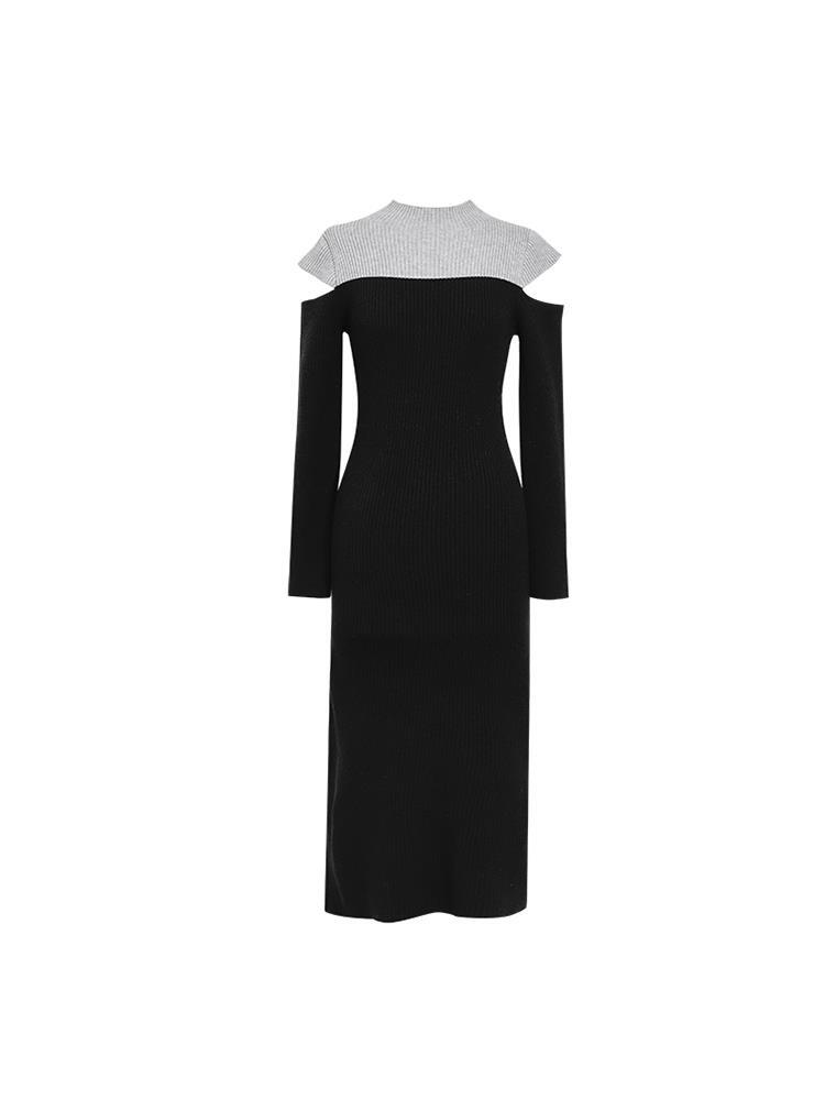 【送料無料】3色 カットアウト ニットワンピース リブ ハイネック Aライン バイカラー 長袖 オープンショルダー 切り替え 大人可愛い カジュアル シンプル かわいい お洒落 こなれ感 エレガント フェミニン 主役級 存在感 レディース スタイルアップ 冬 秋 10代 20代 30代 デート 女子会 休日 着回し 普段使い 韓国 韓国系 ファッション コーデ スタイル モテ トレンド インスタ映え ワンサイズ コーデ ホワイト ブラック グレー アプリコット スリム セーター db4105