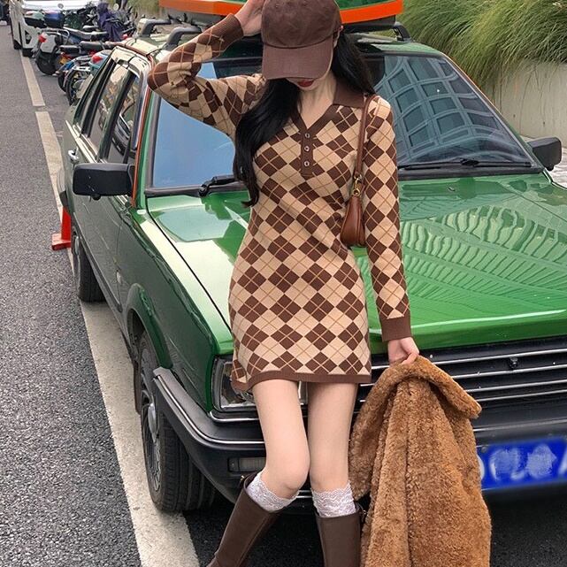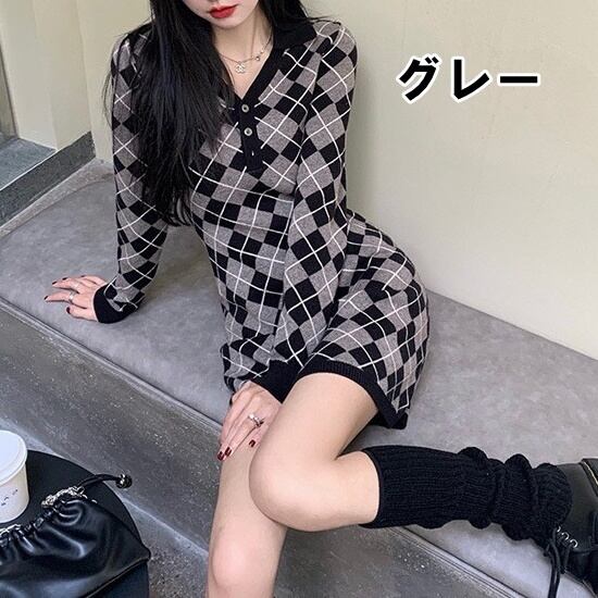 【送料無料】2色 ニットワンピース レディース アーガイル ミニ丈 ニット 無地 長袖 襟付き Vネック 切替 チェック 可愛い かっこいい 灰 グレー カーキ レトロ 大人可愛い おしゃれ カジュアル 大きいサイズ S M L XL 2XL 3XL 4XL こなれ感 インスタ映え 春 秋 冬 10代 20代 30代 通勤 学生 休日 お出かけ 韓国 ママ スタイル ファッション コーデ デート 人気 大人カジュアル クール トレンド スタイル 個性 db4106
