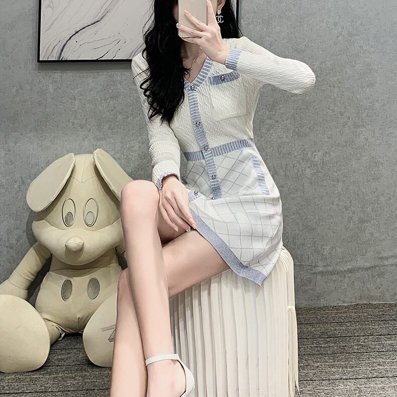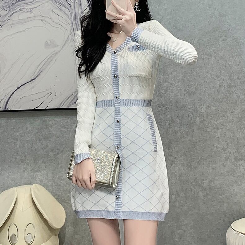 【送料無料】ニットワンピース レディース チェック 格子柄 バイカラー Vネック メタルボタン ミニ丈 ニット 長袖 襟付き 切替 可愛い かっこいい 灰 グレー カーキ レトロ 大人可愛い おしゃれ カジュアル 大きいサイズ S M L XL 2XL 3XL 4XL こなれ感 インスタ映え 春 秋 冬 10代 20代 30代 通勤 学生 休日 お出かけ 韓国 ママ スタイル ファッション コーデ デート 人気 大人カジュアル クール トレンド スタイル 個性 db4108