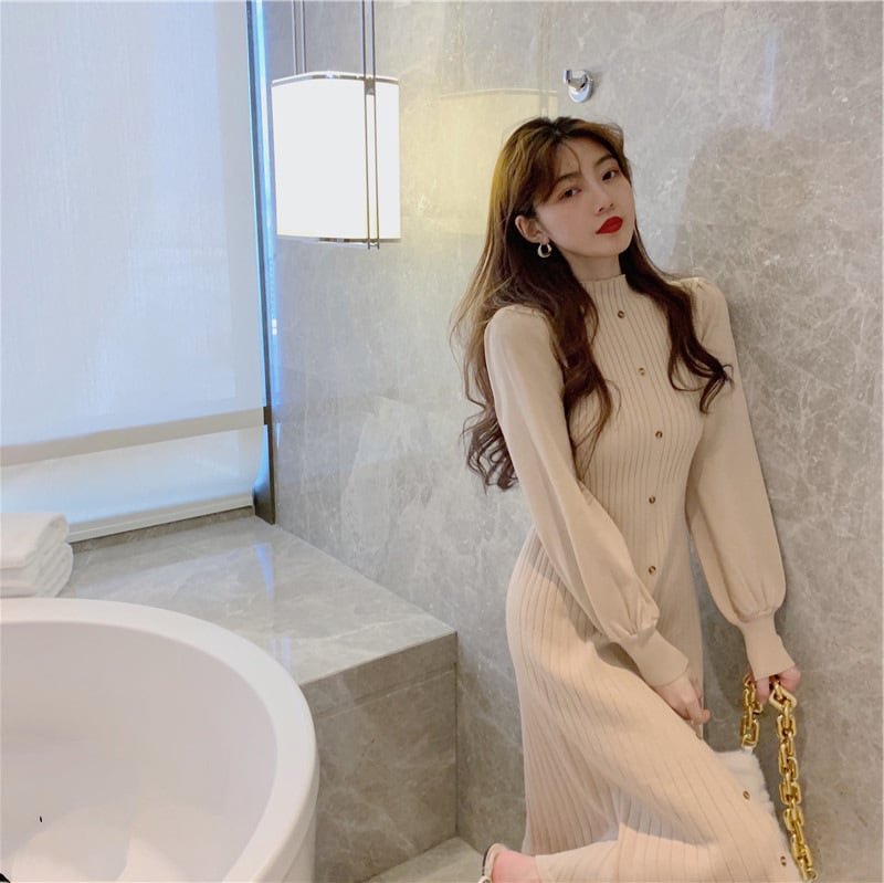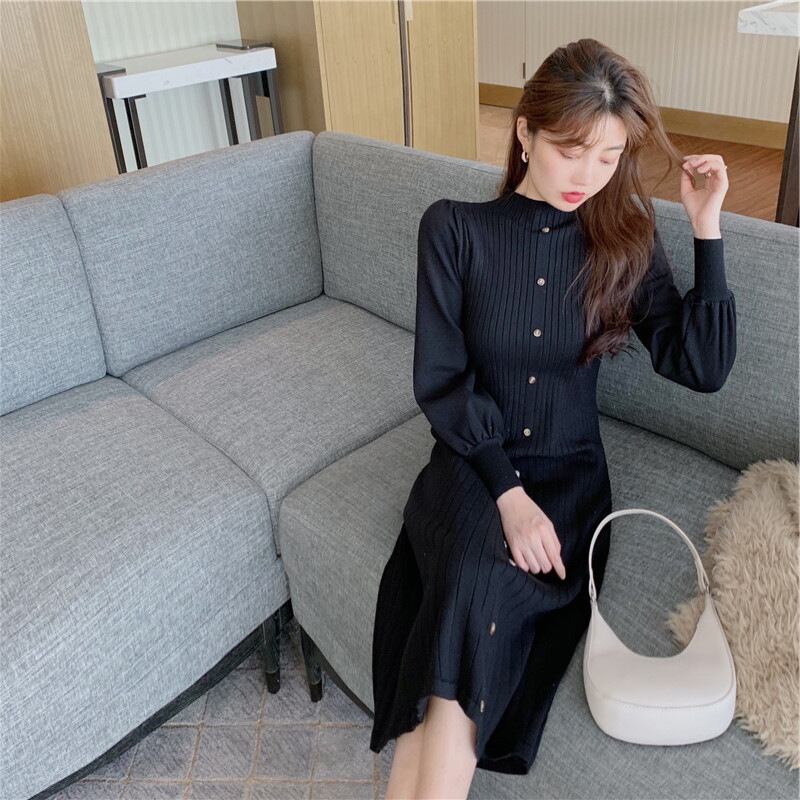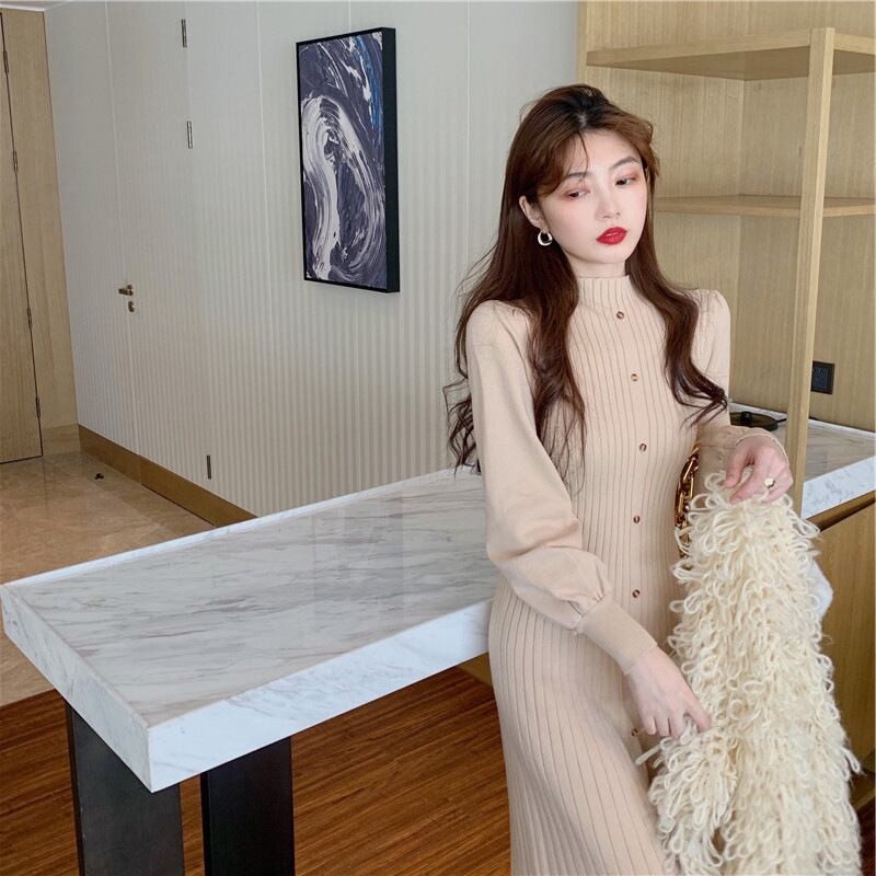 【送料無料】2色 ニットワンピース リブ プチハイネック Aライン 長袖 切り替え パフスリーブ 可愛い カジュアル シンプル かわいい おしゃれ お洒落 こなれ感 エレガント フェミニン 主役級 存在感 レディース スタイルアップ 冬 秋 10代 20代 30代 デート 女子会 休日 着回し 普段使い 韓国 韓国系 ファッション コーデ スタイル モテ トレンド インスタ映え ワンサイズ ガーリー コーデ ホワイト ブラック アプリコット スリム セーター db4112
