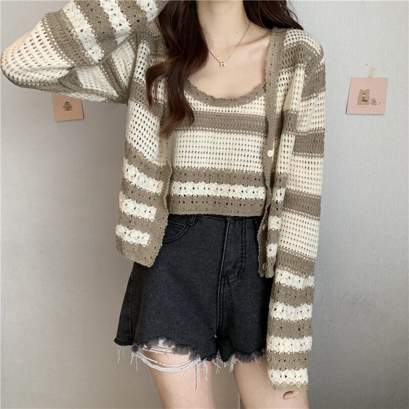 トレンドのクロップ丈のキャミソールととシンプルなカーディガンのセット。