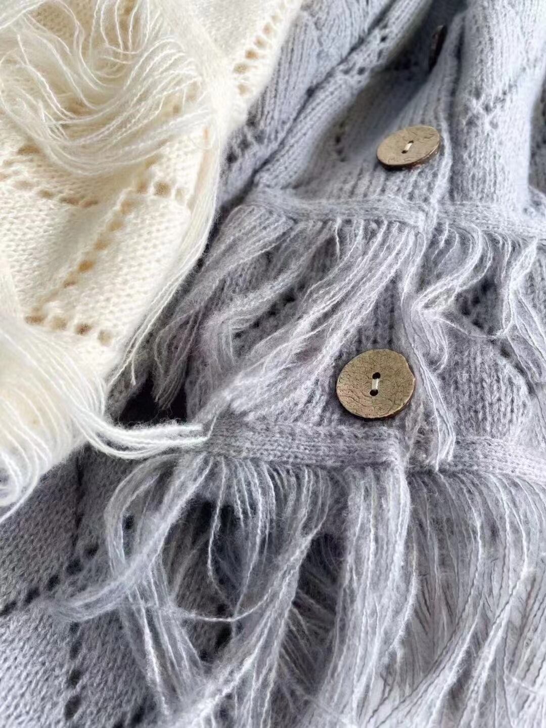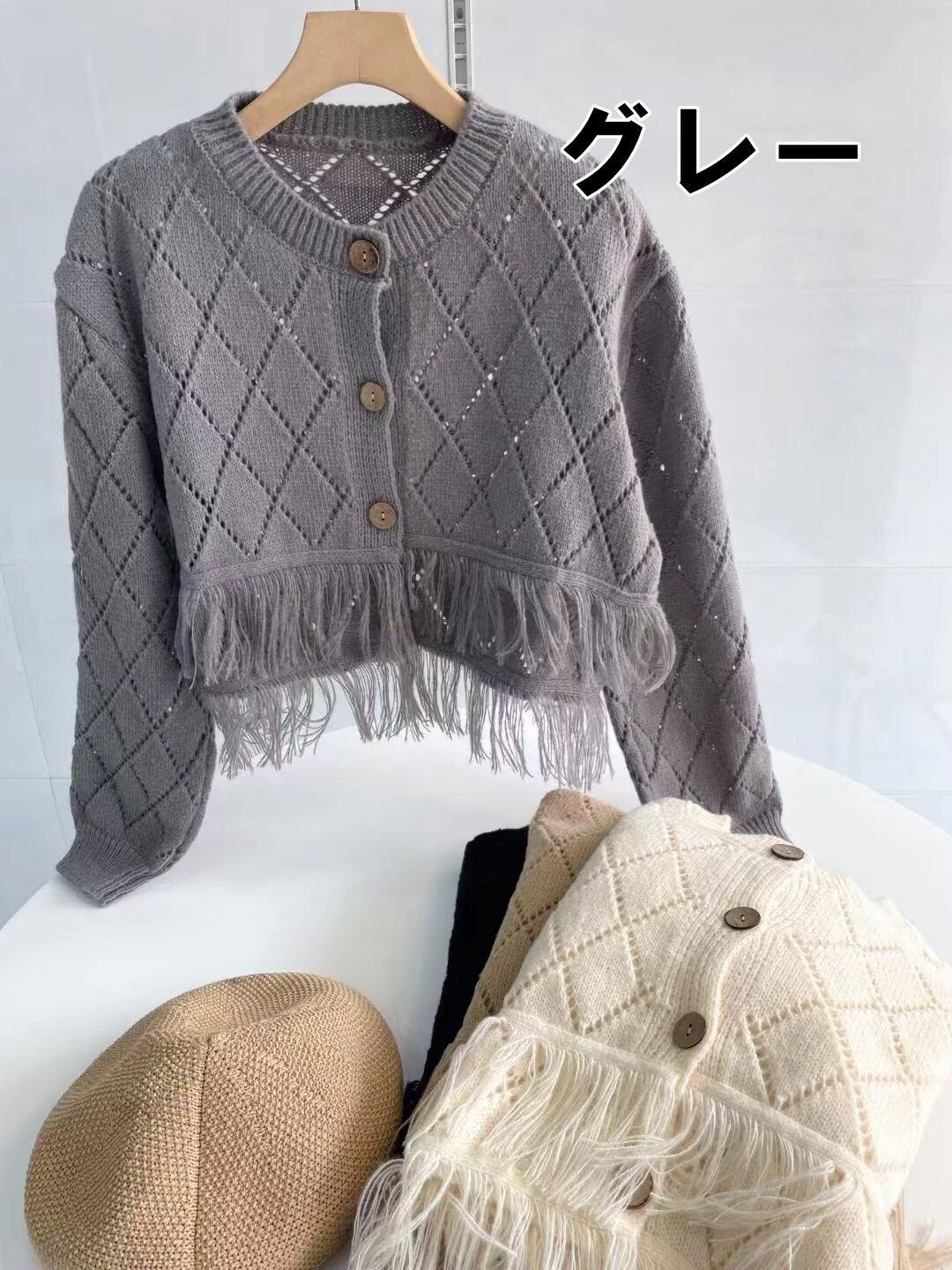 【送料無料】4色 長袖 ニット トップス カーディガン セーター クルーネック ルーズ トップス フリンジ 透かし編み チェック 格子柄 ベージュ グレー ブラック カーキ 個性的 甘め かわいい 大人可愛い きれいめ おしゃれ お洒落 キュート ラブリー ガーリー 主役級 レディース 無地 秋 冬 10代 20代 30代 女性用 女の子 学生 通学 デート お出かけ 女子会 休日 着回し 普段使い 重ね着 ファッション コーデ スタイル トレンド 流行 フリーサイズ ワンサイズ db4144