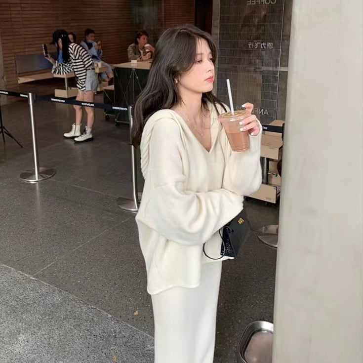 【送料無料】 3色 セットアップ スウェット フード付き スカート 上下セット Vネック もちもち 2点セット 長袖 プルオーバー ミドル丈 黒 白 ホワイト ベージュ ブラウン ブラック 大人可愛い かっこいい おしゃれ カジュアル こなれ感 インスタ映え 春 秋 冬 10代 20代 30代 クール 大人女子 コーデ 通勤 学生 OL 普段使い お揃い 双子 韓国 ファッション 人気 大人カジュアル 映え 無地 トレンド 主役級 女子会 休日 抜け感 存在感 ラフ ツーピース db4156