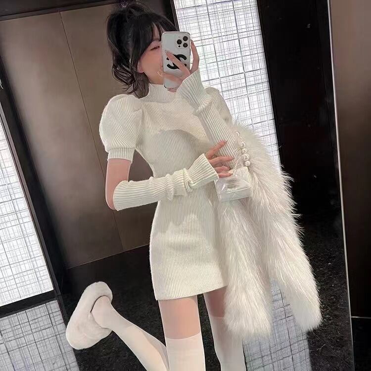 【送料無料】4色 ワンピース リブニット アームカバー アームウォーマー パフスリーブ ハイネック 長袖 半袖 ニット カラーバリエーション ニットワンピース OL 大人可愛い カジュアル シンプル かわいい おしゃれ お洒落 こなれ感 エレガント フェミニン 主役級 存在感 スタイルアップ 冬 秋 10代 20代 30代 デート 女子会 休日 着回し 普段使い 韓国 韓国系 ファッション コーデ スタイル モテ トレンド 流行 インスタ映え シンプルコーデ スリム セーター db4159