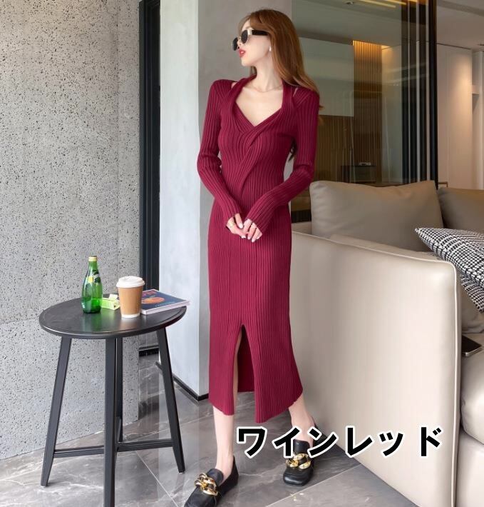 【送料無料】7色 ニットワンピース リブ Vネック スリット ストラップ カットアウト ノット ケーブル編み ハイウエスト ミモレ丈 Aライン 長袖 フリル 切り替え 大人可愛い カジュアル シンプル かわいい お洒落 こなれ感 エレガント フェミニン 存在感 レディース スタイルアップ 冬 秋 10代 20代 30代 デート 女子会 休日 着回し 普段使い ファッション コーデ スタイル トレンド インスタ映え ワンサイズ ガーリー コーデ ホワイト ブラック アプリコット db4160