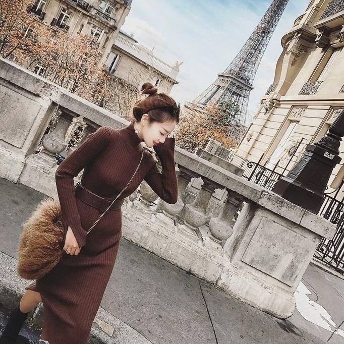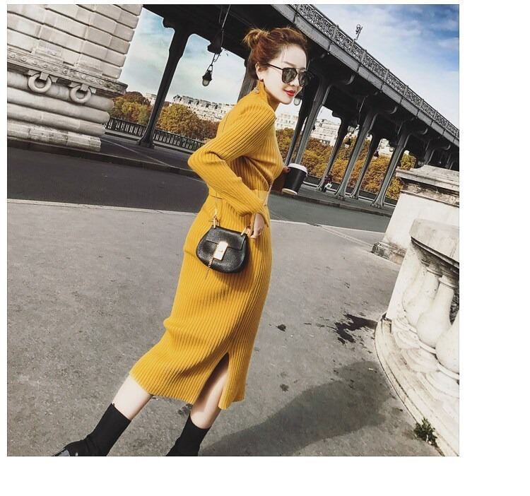 【送料無料】3色 ニットワンピース リブ ベルト付き ハイネック スリット Aライン 長袖 切り替え タイト ミモレ丈 可愛い カジュアル シンプル かわいい おしゃれ お洒落 こなれ感 エレガント フェミニン 主役級 存在感 レディース スタイルアップ 冬 秋 10代 20代 30代 デート 女子会 休日 着回し 普段使い 韓国系 ファッション コーデ スタイル モテ トレンド インスタ映え ワンサイズ ガーリー コーデ イエロー ブラウン ブラック スリム セーター db4172