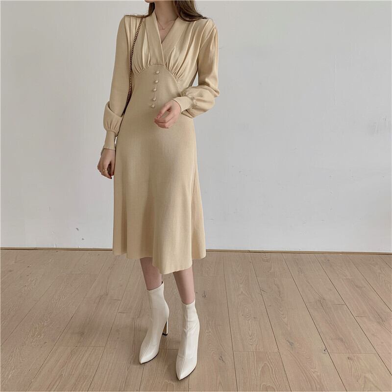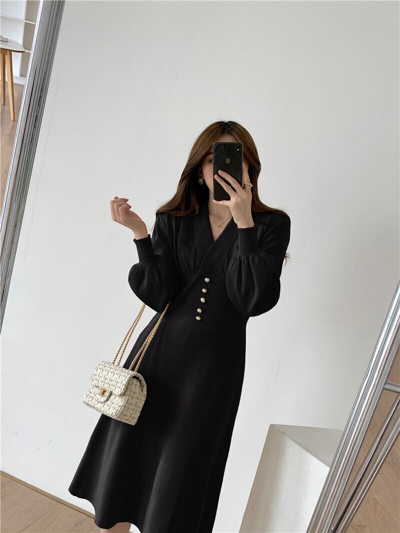 【送料無料】2色 ロングワンピース ドレス ニットドレス Vネック 長袖 パフスリーブ かわいい 大人可愛い きれいめ 大人 おしゃれ お洒落 こなれ感 ラブリー キュート 主役級 存在感 とろみ感 抜け感 フェミニン レディース ハイウエスト 無地 秋 冬 発表会 演奏会 お呼ばれ 10代 20代 30代 OL 通学 デート お出かけ 女子会 休日 着回し 普段使い 韓国 韓国系 オルチャン ファッション コーデ スタイル モテ ワンサイズ トレンド ブラック 黒 ベージュ db4183