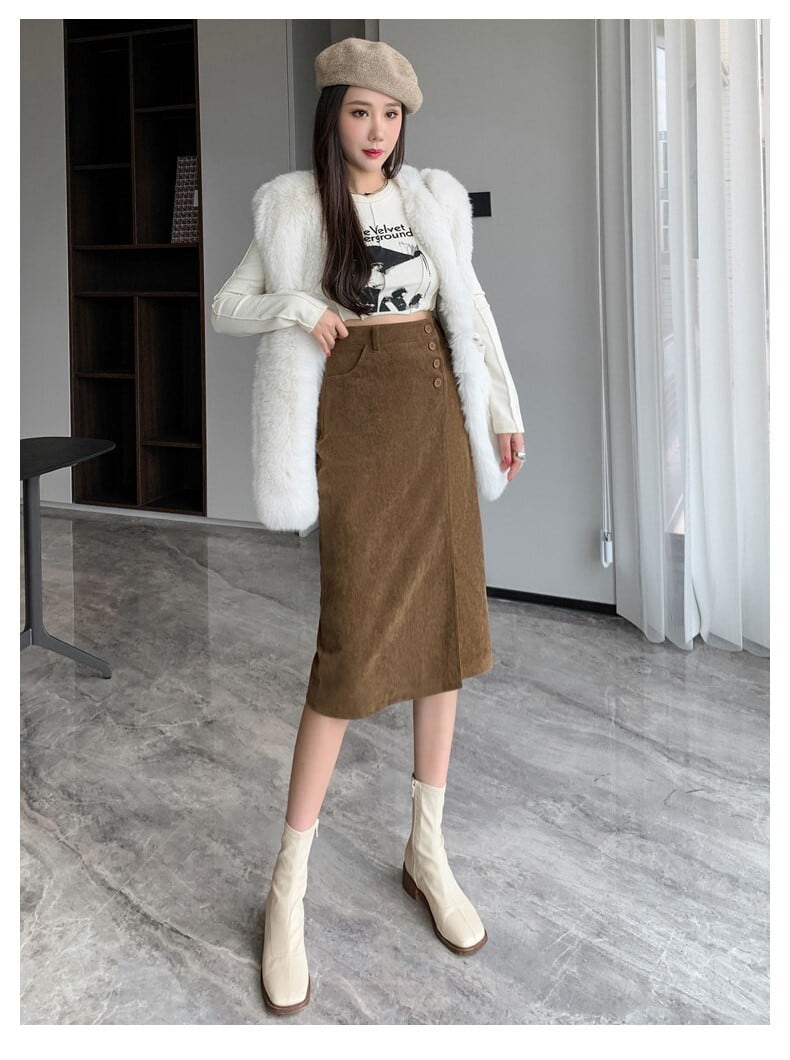 【送料無料】3色 コーデュロイ スカート 膝丈 タイト スリム 細身 かわいい 大人可愛い きれいめ 大人 カジュアル おしゃれ お洒落 かっこいい 大人女子 こなれ感 ラブリー キュート 主役級 存在感 レディース 柄 10代 20代 30代 学生 通学 デート お出かけ 女子会 休日 着回し 普段使い 韓国 韓国系 オルチャン ファッション コーデ スタイル モテ トレンド 流行 インスタ映え S M L XL 2XL 大きいサイズ プチプラ ブラック カーキ ブラウン 茶色 db4219