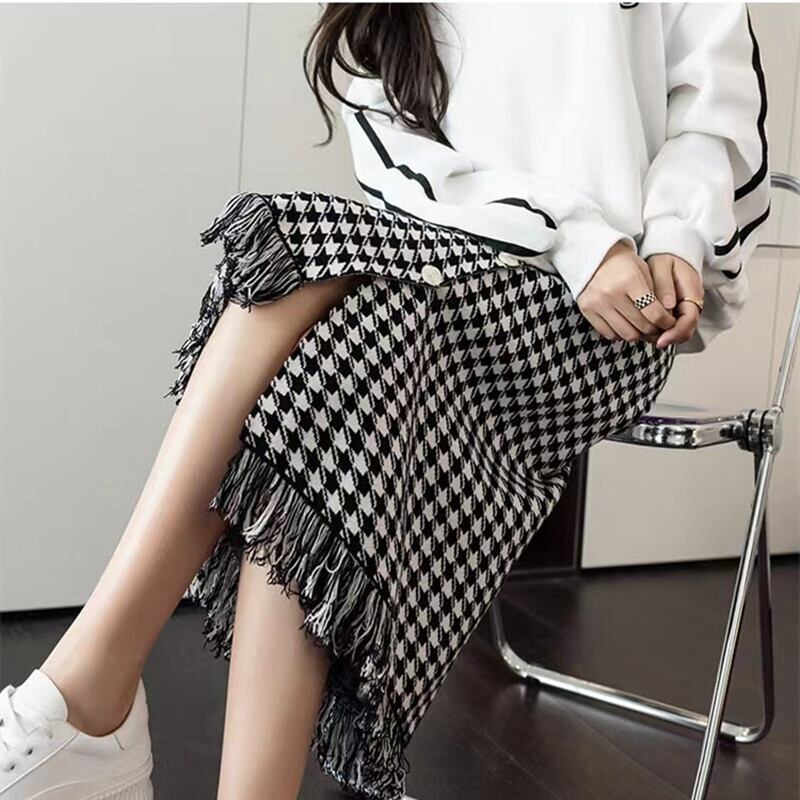 【送料無料】2色 タイトスカート ニットスカート 千鳥格子 ハイウエスト フリンジ アシンメトリー スリム 上品 大人可愛い おしゃれ お洒落 かっこいい こなれ感 エレガント セクシー 主役級 存在感 ボトムス レディース 女性 女の子 無地 秋 冬 10代 20代 30代 40代 OL オフィス 学生 通学 デート お出かけ 女子会 休日 着回し 普段使い 韓国 韓国系 オルチャン ファッション コーデ スタイル 美脚 脚長 トレンド インスタ映え ワンサイズ フリーサイズ 黒 ブラック db4248
