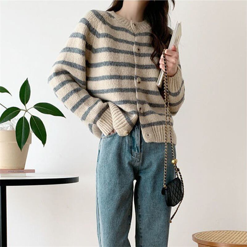 【送料無料】2色 長袖ニット カーディガン セーター ストライプ ボーダー レトロ トップス 長袖 個性的 シンプル かわいい 大人可愛い きれいめ おしゃれ お洒落 キュート ラブリー カジュアル 主役級 存在感 レディース 柄 秋 冬 10代 20代 30代 女性用 女の子 学生 通学 デート お出かけ 女子会 休日 着回し 普段使い 重ね着 韓国 韓国系 オルチャン ファッション コーデ スタイル インスタ映え トレンド 流行 フリーサイズ ワンサイズ グレー 灰色 ブラウン 茶色 db4255