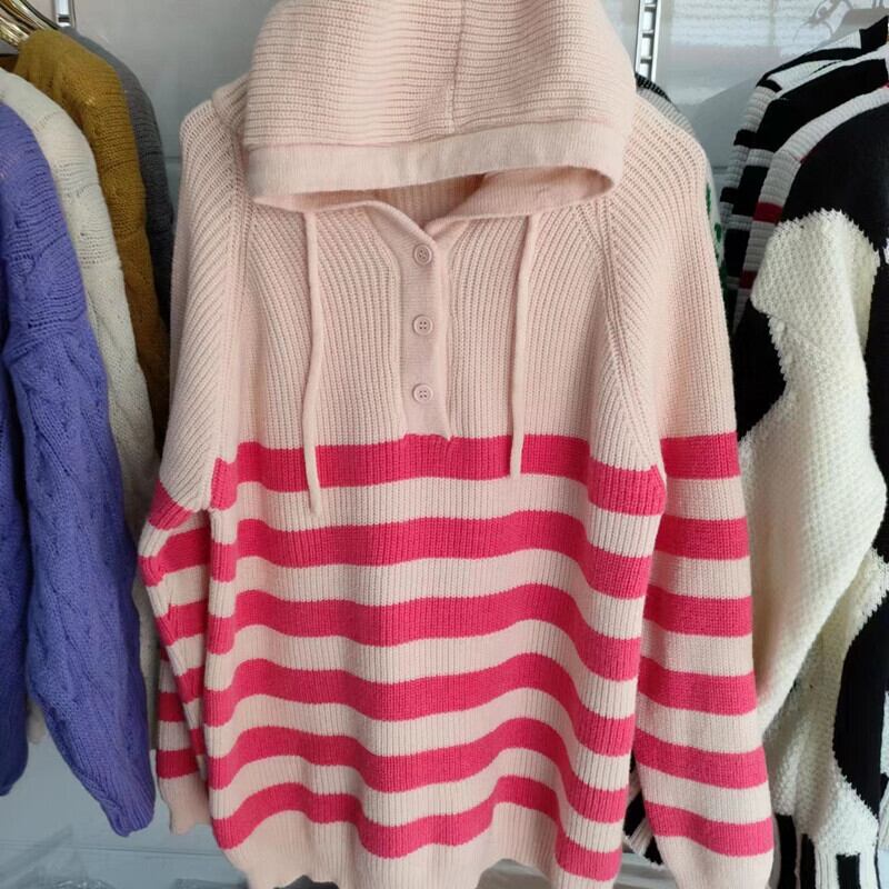 【送料無料】3色 長袖ニット フーディー プルオーバー フード付き ストライプ ボーダー レトロ トップス 長袖 個性的 シンプル かわいい 大人可愛い きれいめ おしゃれ お洒落 キュート ラブリー カジュアル 主役級 存在感 レディース 柄 秋 冬 10代 20代 30代 女性用 女の子 学生 通学 デート お出かけ 女子会 休日 着回し 普段使い 重ね着 韓国 韓国系 オルチャン ファッション コーデ スタイル インスタ映え トレンド ワンサイズ ベージュ ブラック 黒 ピンク db4262