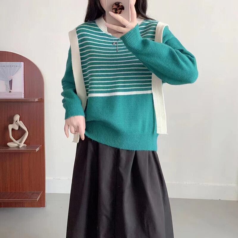 【送料無料】3色 長袖ニット セーター プルオーバー クルーネック ストライプ ボーダー レトロ トップス 長袖 シンプル かわいい 大人可愛い きれいめ おしゃれ お洒落 キュート ラブリー カジュアル 主役級 存在感 レディース 柄 秋 冬 10代 20代 30代 女性用 女の子 学生 通学 デート お出かけ 女子会 休日 着回し 普段使い 重ね着 韓国 韓国系 オルチャン ファッション コーデ スタイル インスタ映え トレンド 流行 ゆったり ワンサイズ ホワイト ピンク グリーン db4269