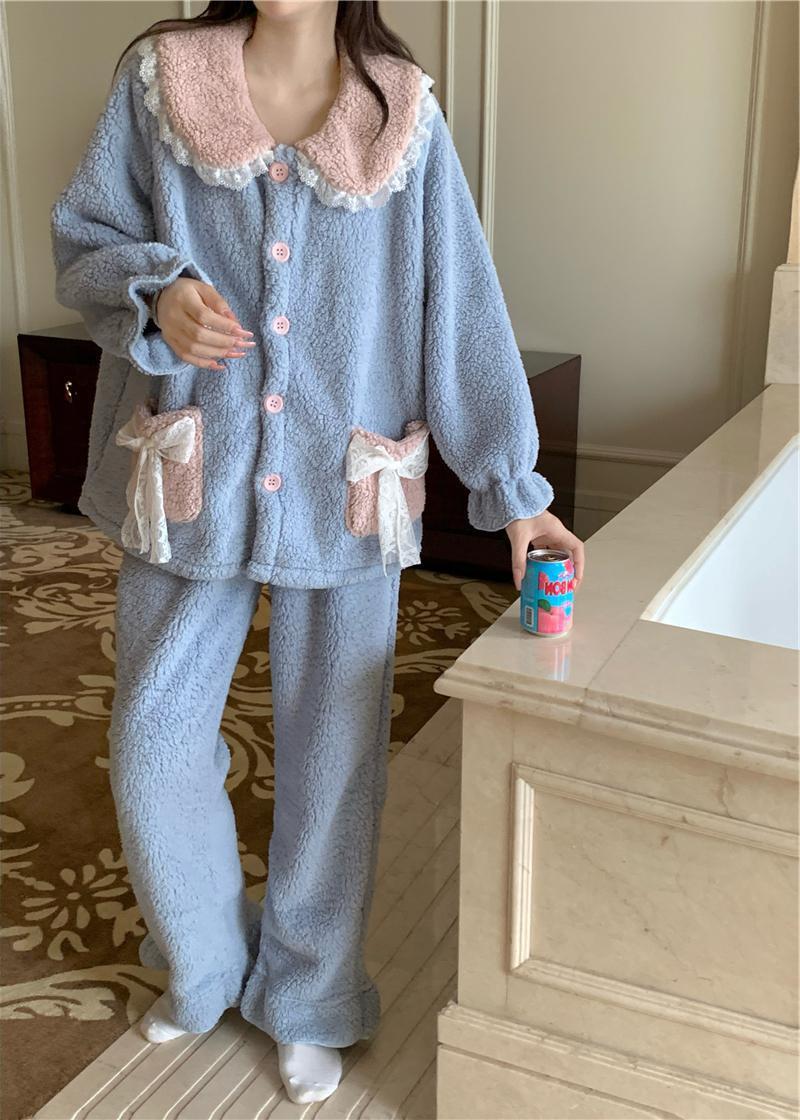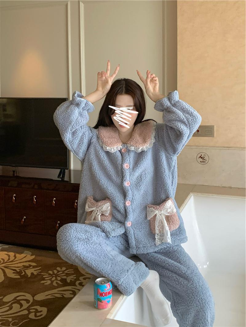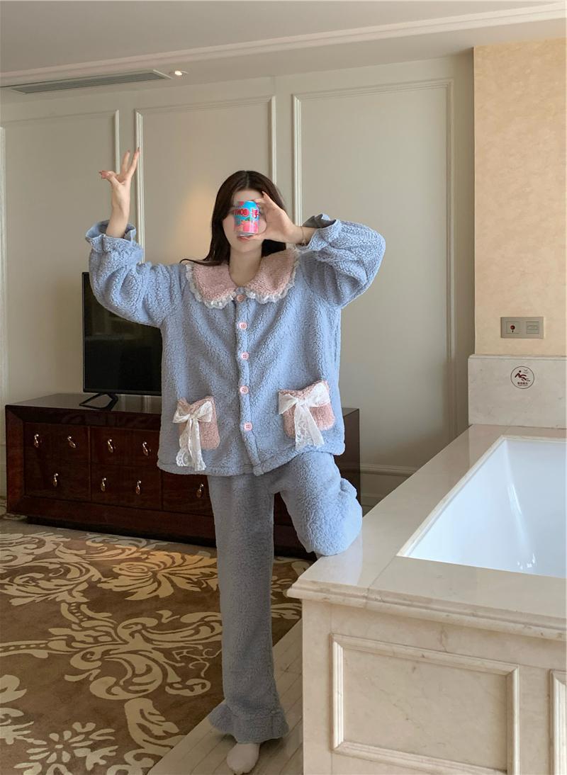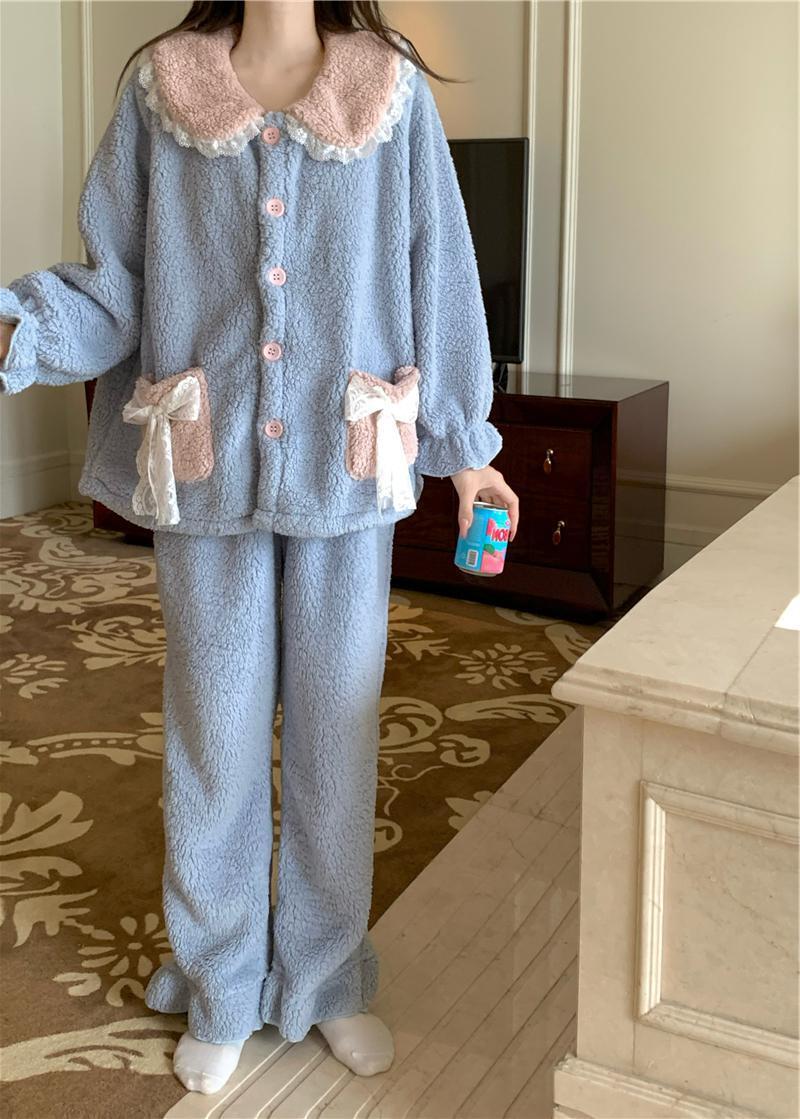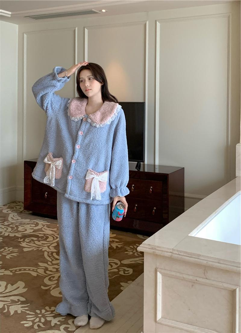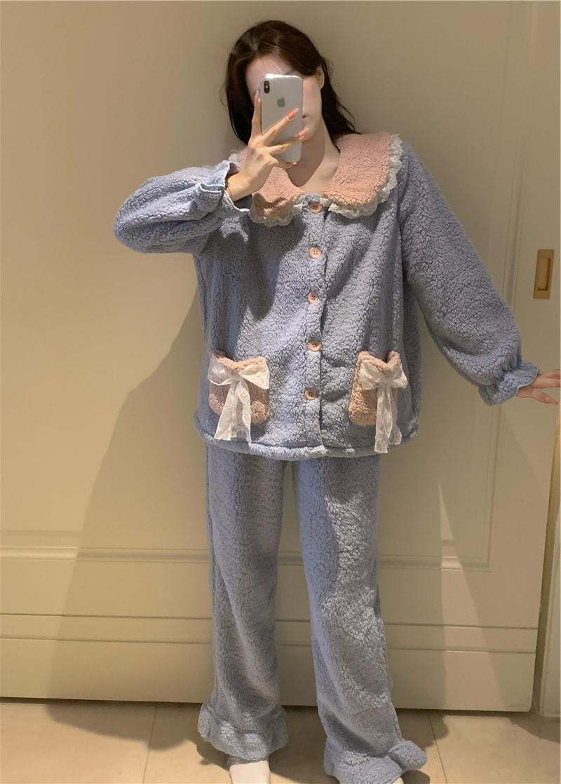 【送料無料】もこもこ ルームウェア セットアップ ツーピース 上下セット リボン レース ガーリー ふわふわ 個性的 暖かい 可愛い ラブリー キュート 秋冬 着る毛布 レディース 部屋着 ラフ ナイトウエア パジャマ 寝間着 お家コーデ ブルー パープル ワンサイズ フリーサイズ インスタ映え 普段使い デイリー使い お泊り 女子会 お揃い 双子 旅行 パジャマパーティ 主役級 トレンド 抜け感 オシャレ ゆったり らくちん ルーズ ゆる プチプラ プレゼント 10代 20代 db4550
